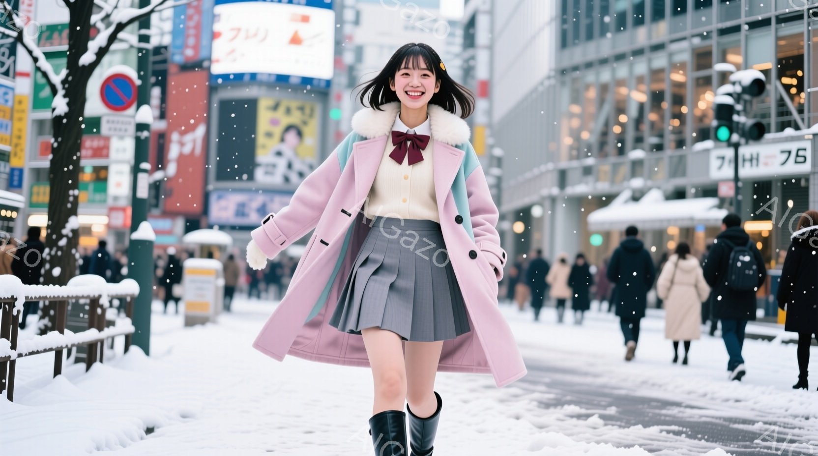 画像には、ピンク色のコートを着て、チェック柄のスカートを履いた若い女性が写っています。彼女は笑顔で、片足を前に出し、楽しそうに歩いているように見えます。背景には雪が降り積もる街並み、高層ビル、そして多くの人が見え、活気と冬の雰囲気が漂っています。