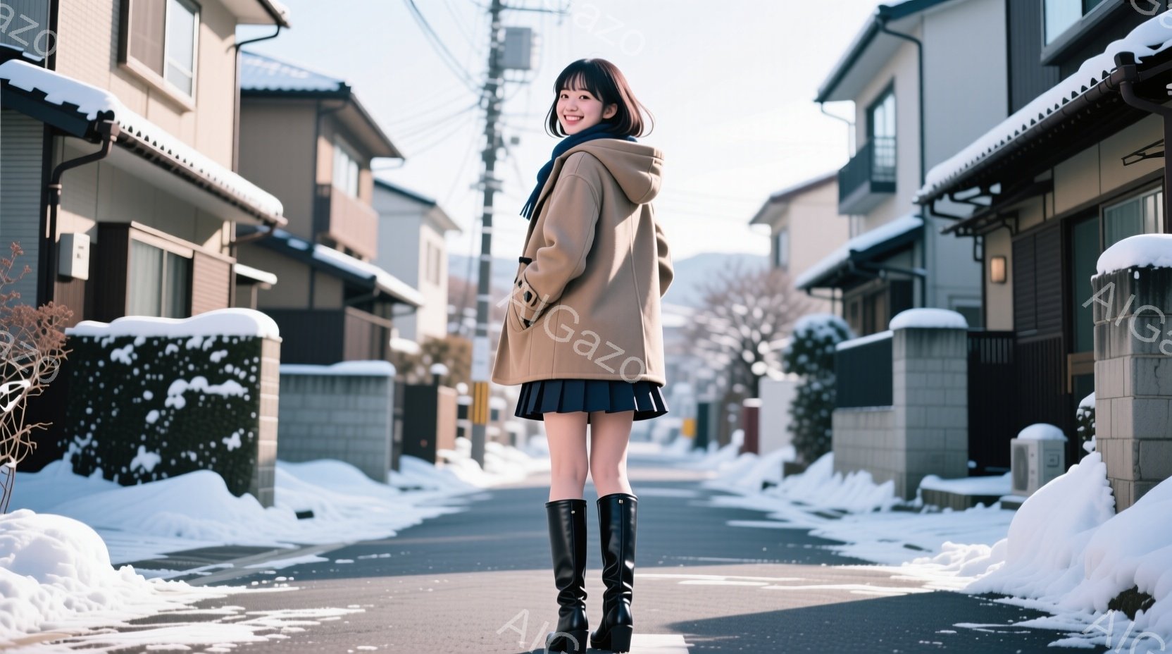 少女はベージュ色の短いコートと黒いスカート、膝丈の黒いブーツを着用し、道路の中央を背にして立っている。彼女は少し微笑んでおり、明るい表情をしている。背景には、雪に覆われた住宅街が広がり、冬の穏やかな雰囲気を醸し出している。