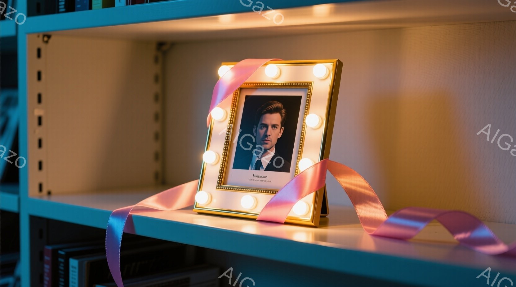 白い棚の上に、赤いリボンで飾られた光るフォトフレームが置かれています。フレームの中には、黒髪で白いトップスを着た女性が写っており、少し物憂げな表情をしています。背景には様々な本が並び、全体的に落ち着いた、暖かな雰囲気を醸し出しています。