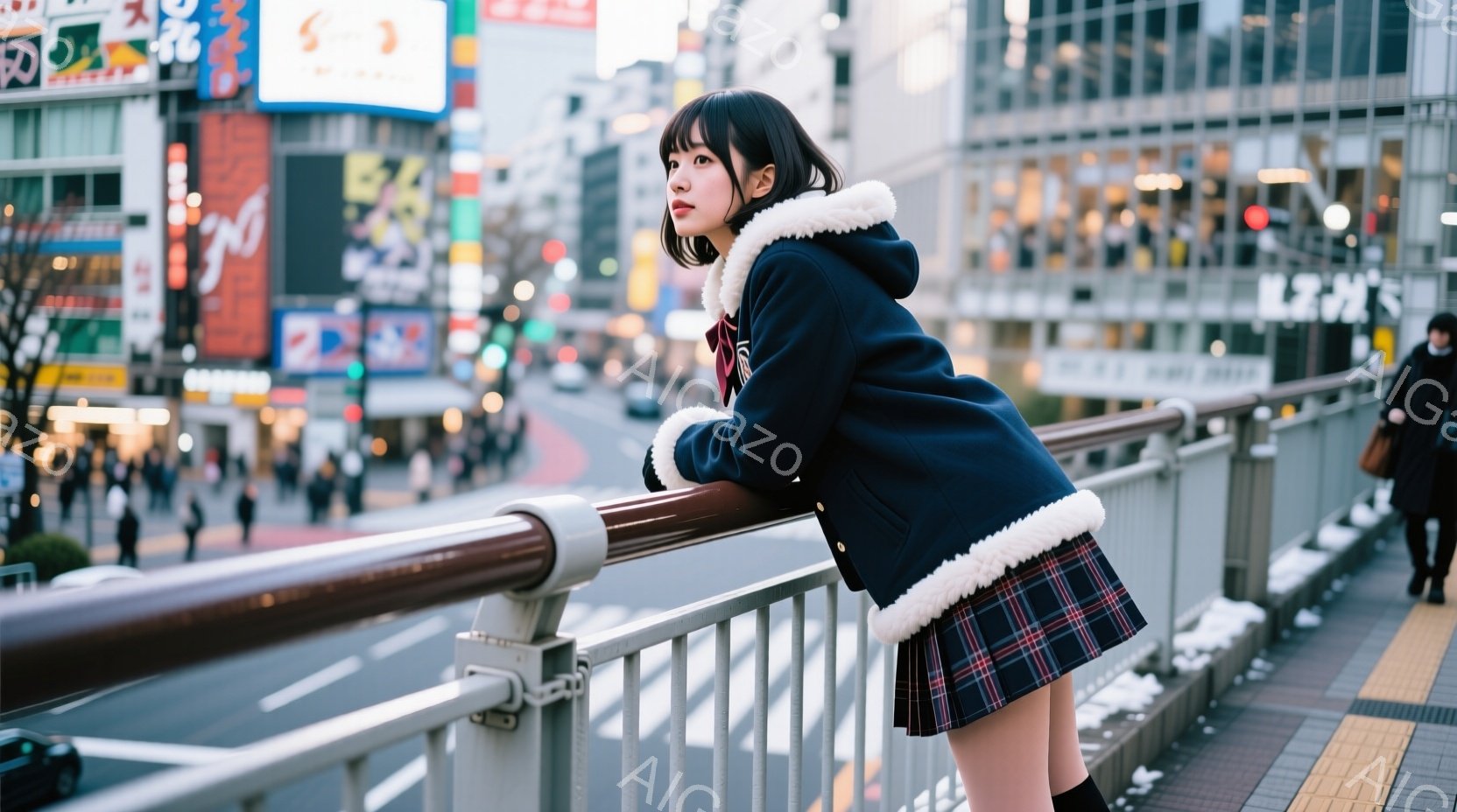 画像には、歩道橋の上で欄干にもたれかかる若い女性が写っています。彼女は紺色のファー付きのジャケットとチェック柄のスカート、黒いニーハイソックスを着用し、ダークブラウンのボブヘアにしています。背景には賑やかな都市の風景が広がり、多くの建物や交通信号、そして多くの車が見え、薄暗い空が都市の活気を際立たせています。