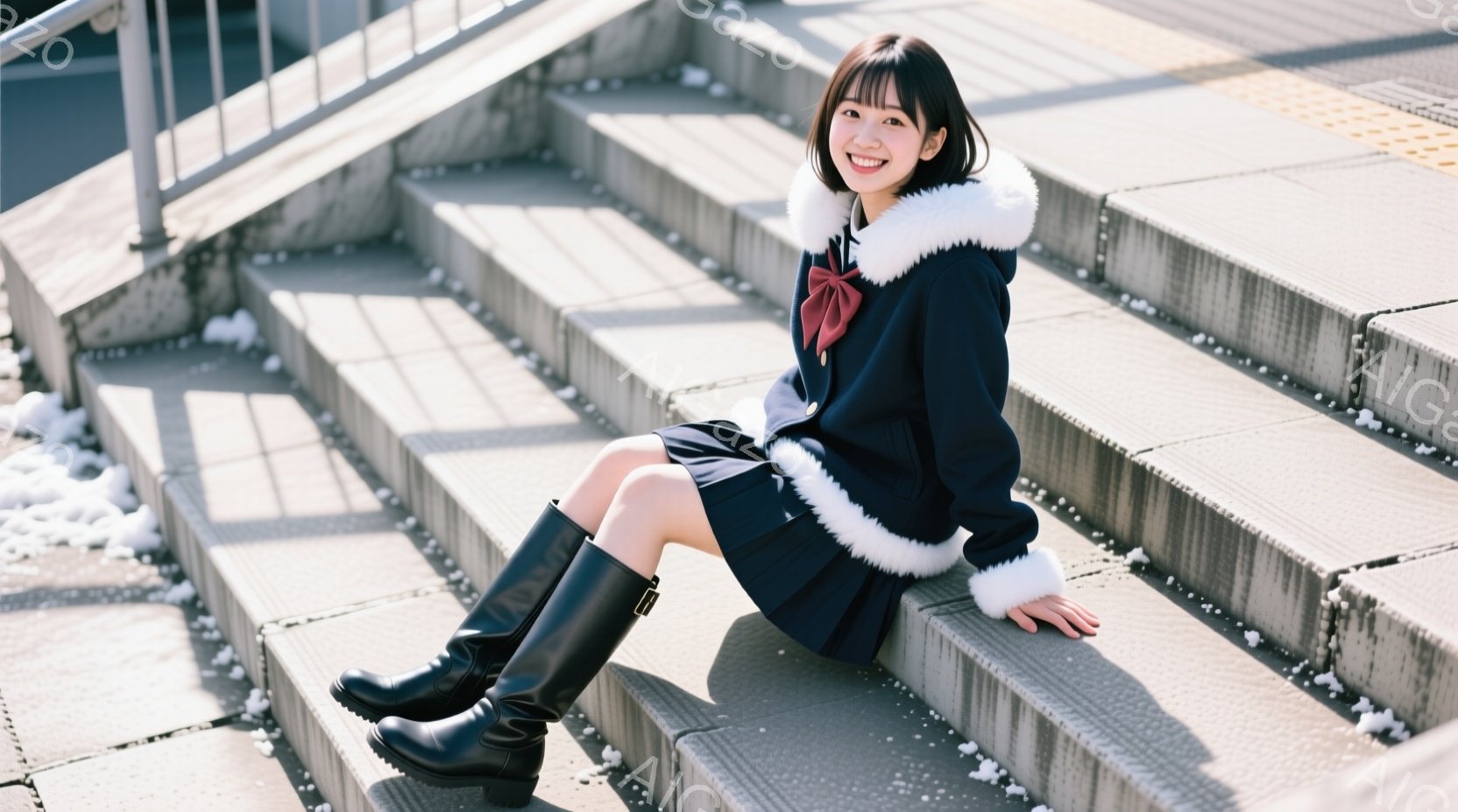 画像には、制服を着た若い女性がコンクリートの階段に座っている様子が写っています。彼女は膝を曲げ、片足を伸ばして座っており、黒いニーハイブーツを履いています。背景は冬の風景で、階段の周りには雪が積もり、穏やかで少し寒々しい雰囲気が漂っています。