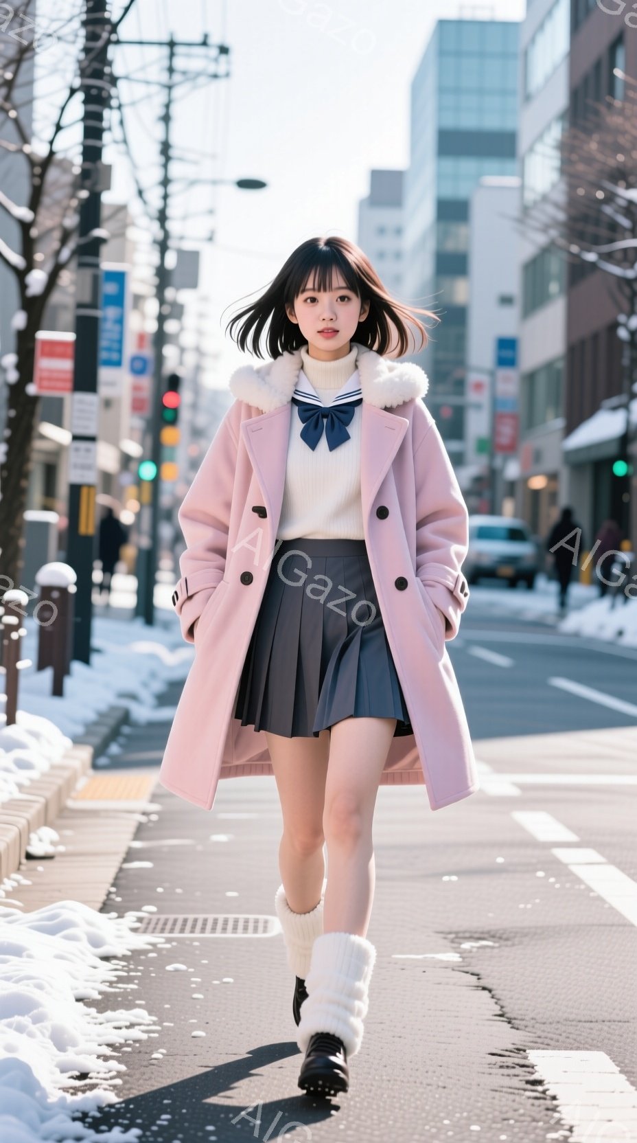 若い女性が、ベージュ色のオーバーコートと黒のミニスカート、膝丈の黒いブーツを着用して、狭い路地に立っている。彼女は前を向き、わずかに微笑んでおり、髪は短くストレートで、前髪は目に少しかかっている。背景には、多くの看板や店舗が並び、路面は濡れており、やや曇った日の雰囲気である。