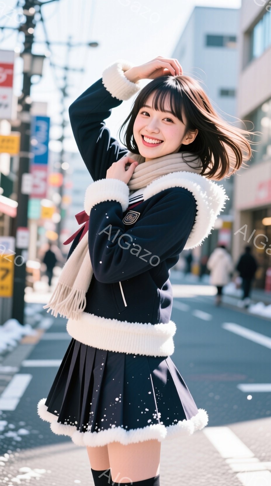 画像は、紺色と紫色のチェック柄のプリーツスカートと、白いフリルが付いた紺色のジャケットを着た若い女性が写っています。彼女は明るい笑顔を浮かべ、髪を軽く触りながら、横向きに立っています。背景には、道路、歩道、そして建物の見える都会の風景が広がっており、晴れた日の活気ある雰囲気が感じられます。