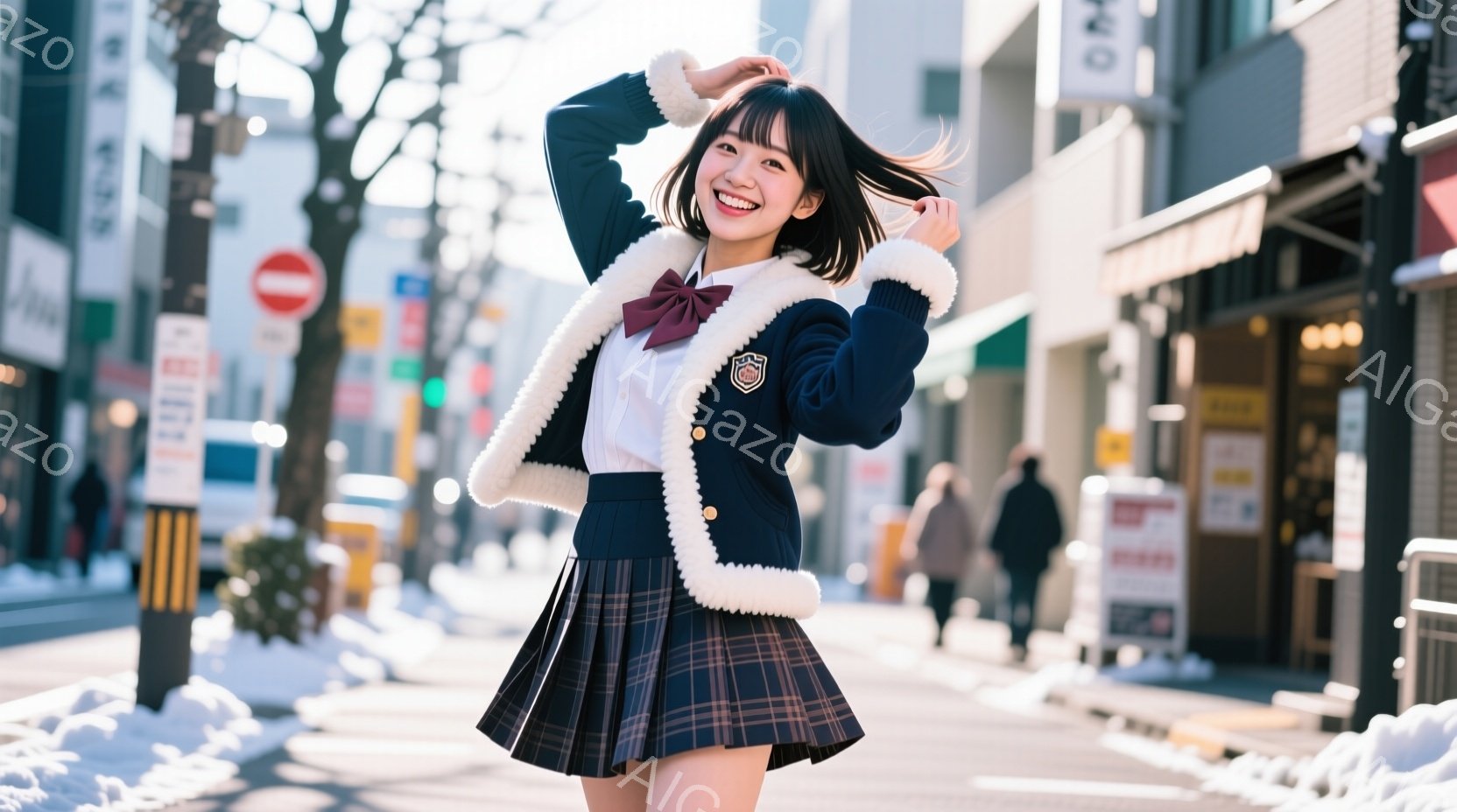 紺色の冬の制服を着た若い女性が、道路の中央で両手を頭の上に上げて笑顔でポーズをとっています。彼女はチェック柄のスカート、白いフリル付きの襟、赤いリボンを結んだ髪で、明るく元気な印象を与えます。背景には商店や建物が並び、晴れた日の街並みが広がっており、全体的に活気に満ちた雰囲気です。