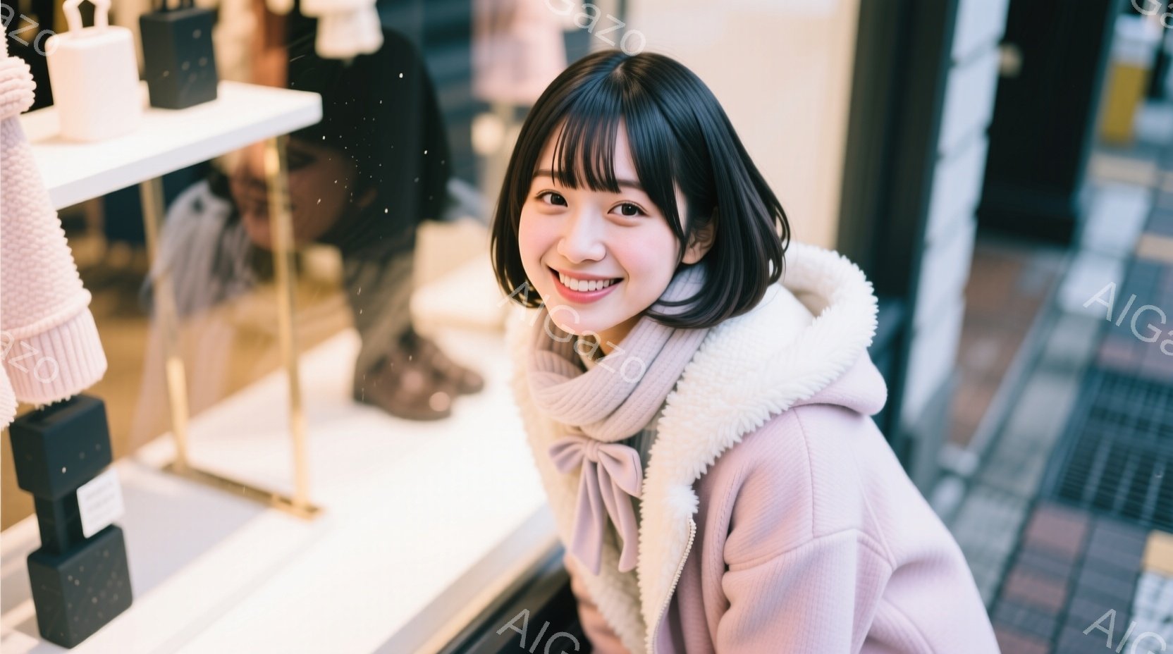 「若い女性が、淡いピンク色のパーカーとマフラーを身に着け、ショーウィンドウの前で微笑んでいます。彼女は長い前髪と肩までの長さの髪を持ち、明るい笑顔を見せています。」は、2025年11月29日に作成されたAI生成画像です。 かわいいをテーマとした高品質なビジュアル素材で、 1664×928px の解像度で提供しています。 個人利用・商用利用ともに無料でダウンロード可能で、クレジット表記も不要です。