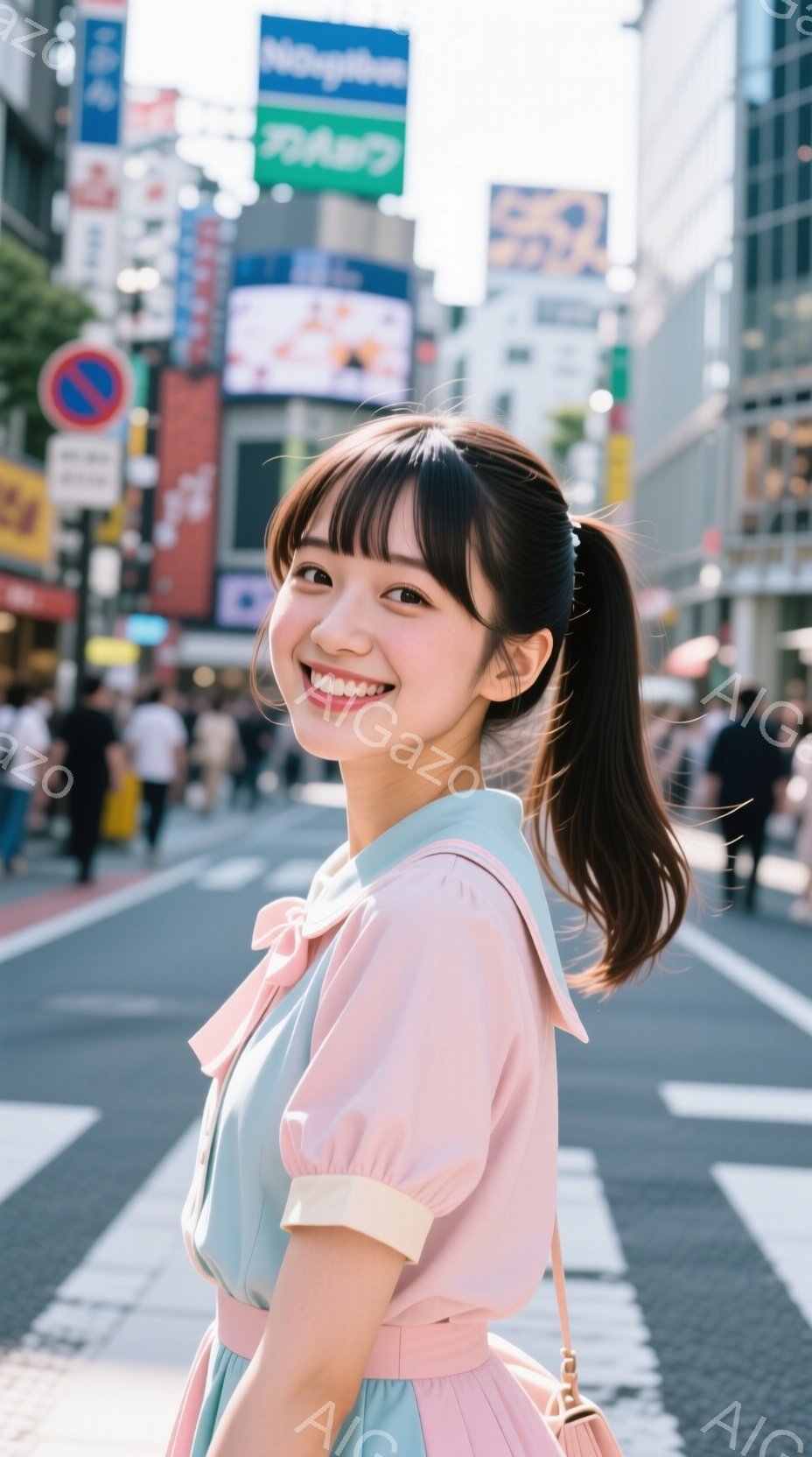 画像は、ベージュ色のファー付きパーカー、黒のプリーツスカート、黒のタイツを着用した若い女性を捉えています。彼女は少し振り返り、こちらを見つめており、表情はわずかに微笑んでいます。背景には、商店や建物が並び、地面には雪が残っており、冬の街並みが広がっています。