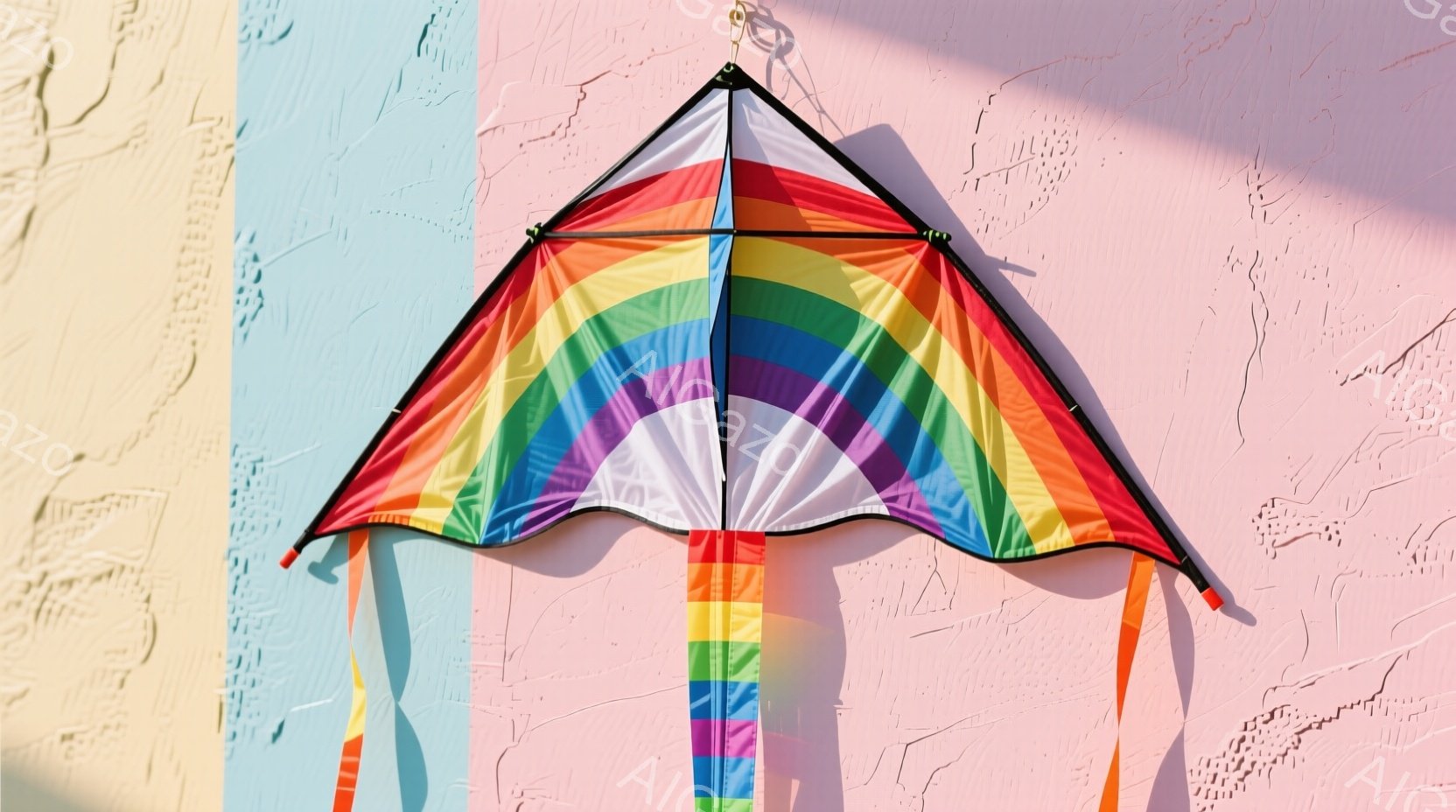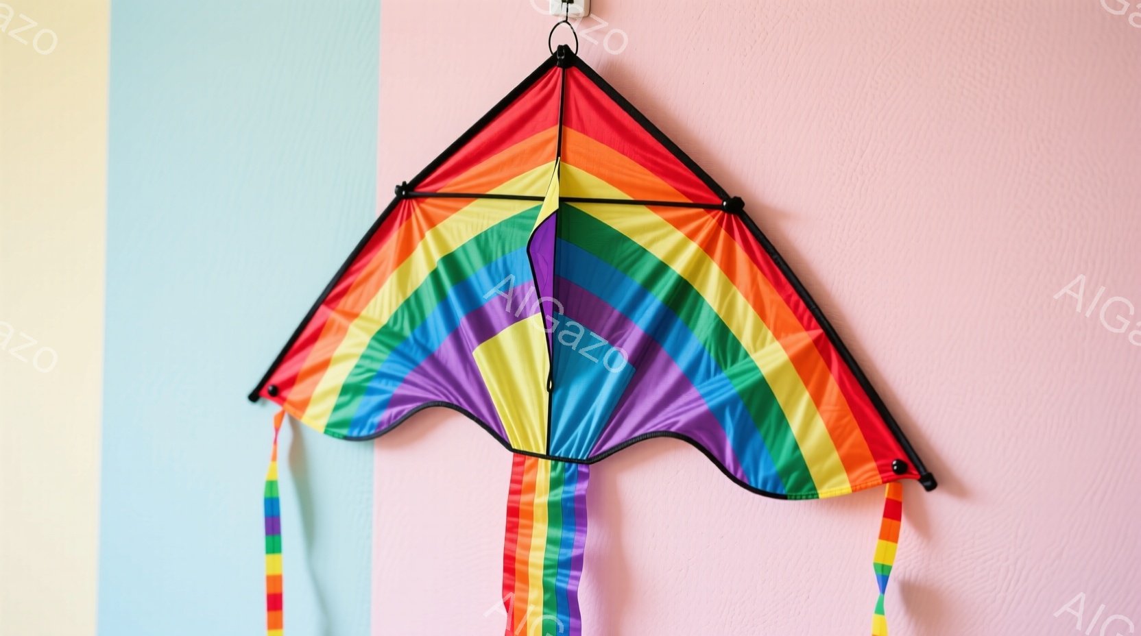 カラフルな凧が、水色の壁を背景に吊り下げられています。凧は虹色で、赤、オレンジ、黄色、緑、青、紫の鮮やかな色が、中心から放射状に広がっています。壁は少しテクスチャがあり、ソフトピンクのエリアが左右に広がっています。