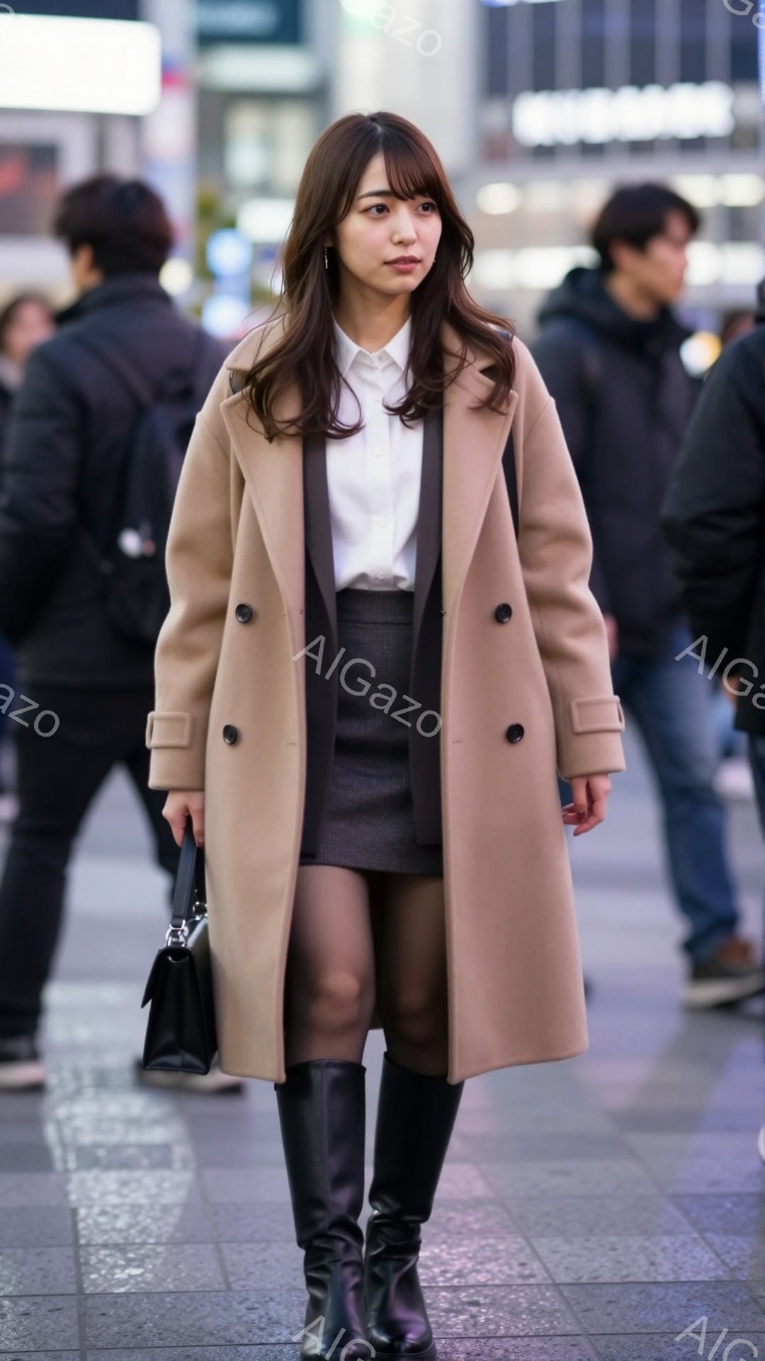 「長いキャメル色のコートを羽織った女性が写っています。彼女はグレーのタイトスカートと白いセーターを合わせ、黒いバッグを持っています。背景には人々と建物が見え、日中」は、2025年11月29日に作成されたAI生成画像です。 おしゃれをテーマとした高品質なビジュアル素材で、 1080×1920px の解像度で提供しています。 個人利用・商用利用ともに無料でダウンロード可能で、クレジット表記も不要です。