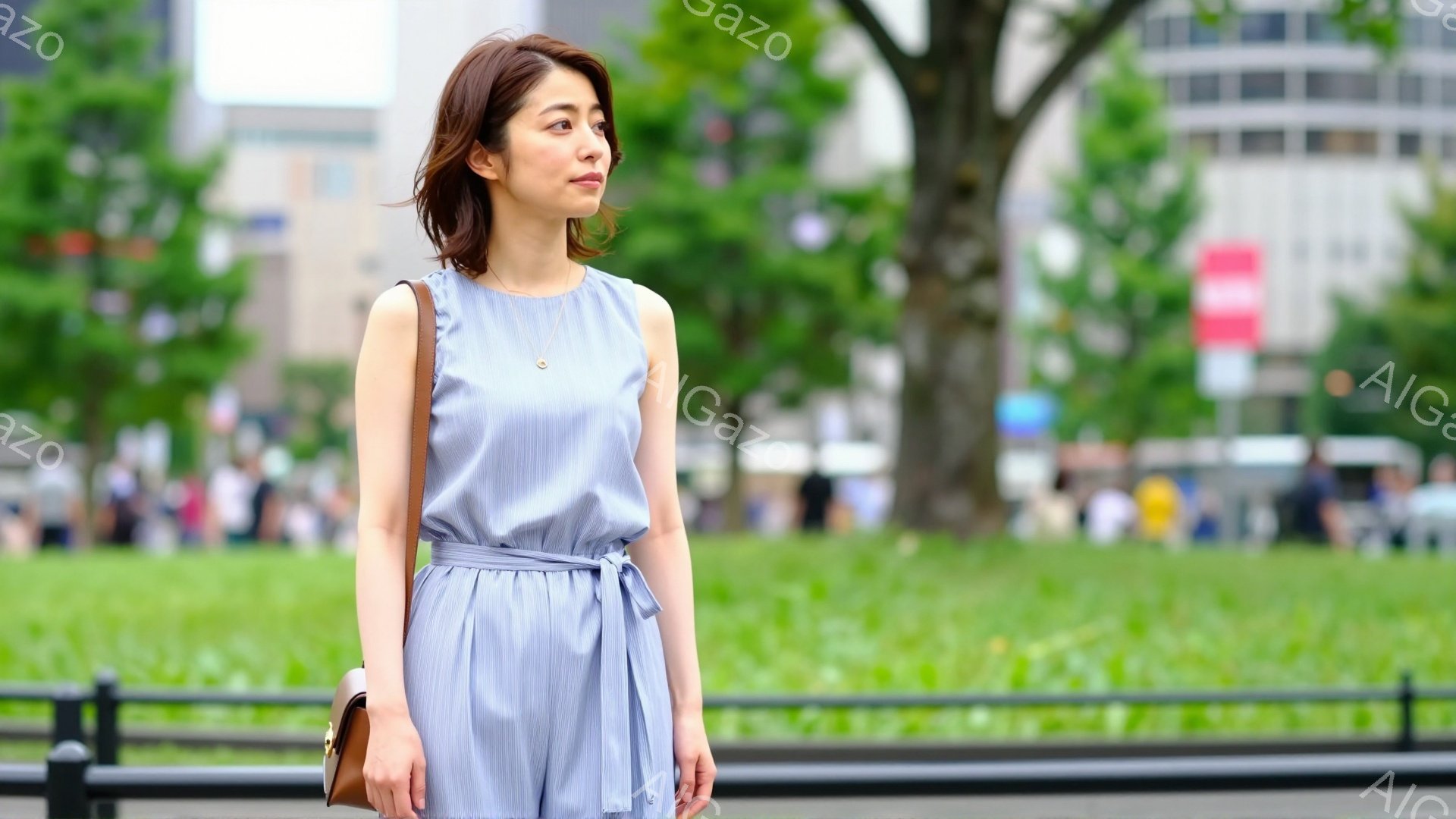 「画像には、公園の前に立つ若い女性が写っています。彼女は水色のノースリーブブラウスと、アイボリーのワイドパンツを着用し、茶色の細いベルトでウエストマークしています」は、2025年11月29日に作成されたAI生成画像です。 カジュアルをテーマとした高品質なビジュアル素材で、 1920×1080px の解像度で提供しています。 個人利用・商用利用ともに無料でダウンロード可能で、クレジット表記も不要です。