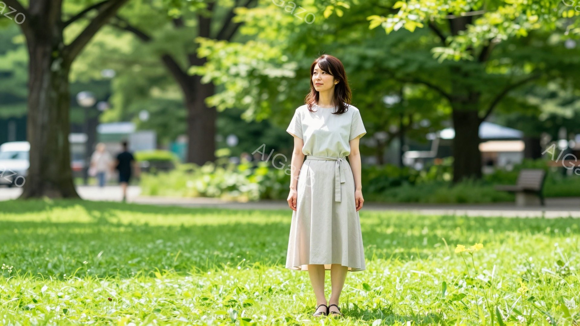 この女性は白いTシャツと紺色のワイドパンツを着用し、肩までの長さのダークブラウンの髪をしています。彼女はやや横を向き、穏やかな表情で遠くを見つめており、リラックスした姿勢で立っています。背景には緑豊かな木々が立ち並び、遊歩道が続いており、晴天の下、穏やかな春または夏の日の雰囲気が漂っています。
