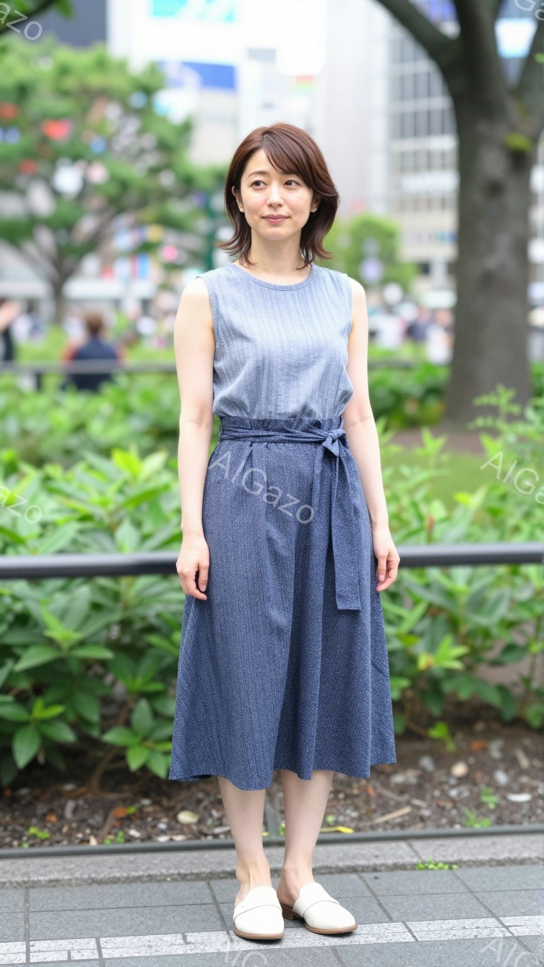 「モデルは、明るい青色のストライプとドット柄のミモレ丈ワンピースを着て、黒の革靴を履いています。彼女は少し横を向いており、顔はリラックスした表情で、少し微笑んでい」は、2025年11月29日に作成されたAI生成画像です。 カジュアルをテーマとした高品質なビジュアル素材で、 1080×1920px の解像度で提供しています。 個人利用・商用利用ともに無料でダウンロード可能で、クレジット表記も不要です。
