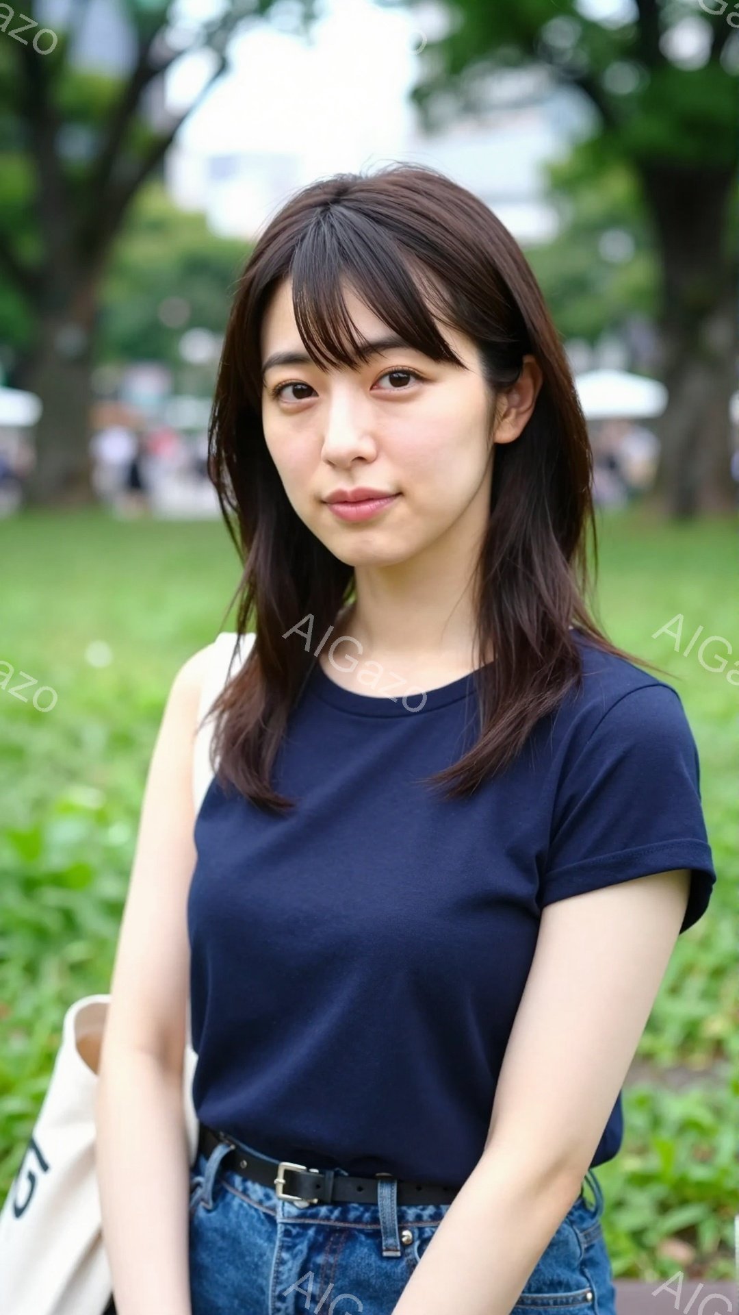 若い女性が芝生のある公園で正面を向いて立っている。彼女は水色のタンクトップとデニムのショートパンツを着ており、黒髪を肩のあたりで切り揃えている。穏やかな笑顔を浮かべ、リラックスした雰囲気で、肩に黒いバッグをかけている。