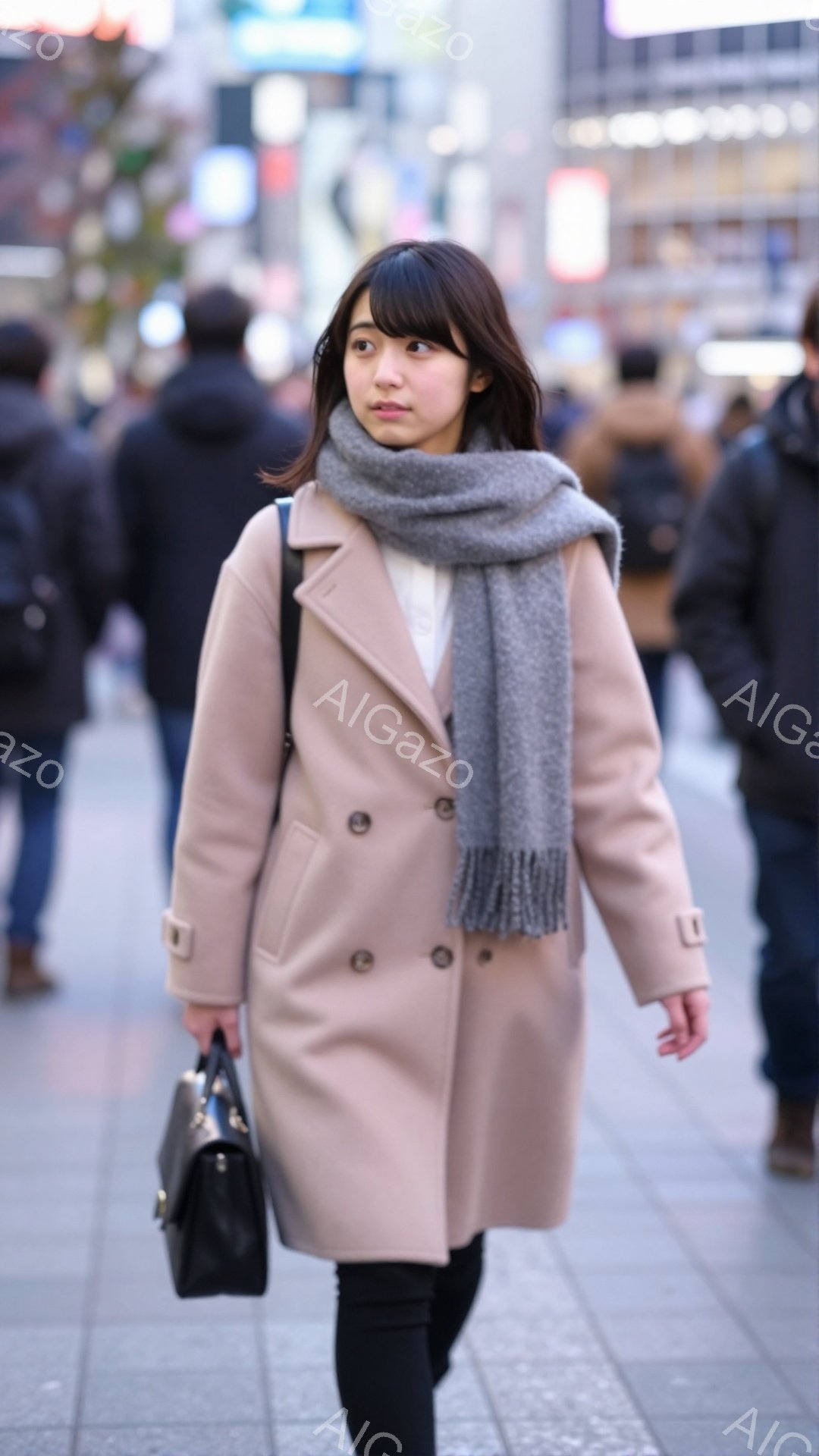 「浅いベージュ色のコートを着た若い女性が、黒いスキニーパンツとブーツを履いて歩いています。彼女は肩までの中くらいの長さの黒髪で、ストレートな前髪があり、穏やかな表」は、2025年11月29日に作成されたAI生成画像です。 カジュアルをテーマとした高品質なビジュアル素材で、 1080×1920px の解像度で提供しています。 個人利用・商用利用ともに無料でダウンロード可能で、クレジット表記も不要です。