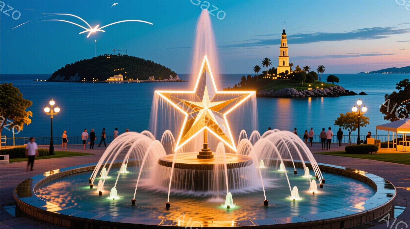 夜の海岸沿いに、星形の噴水が光り輝いている。噴水の背景には、小島と建物のシルエットが見え、穏やかな海と夕焼け空が広がっている。数人の人々が噴水や海岸沿いを散歩しており、リラックスした雰囲気が漂っている。