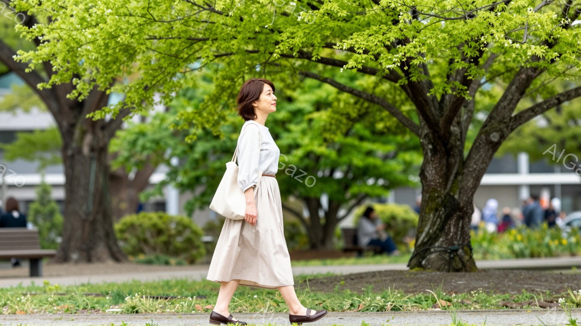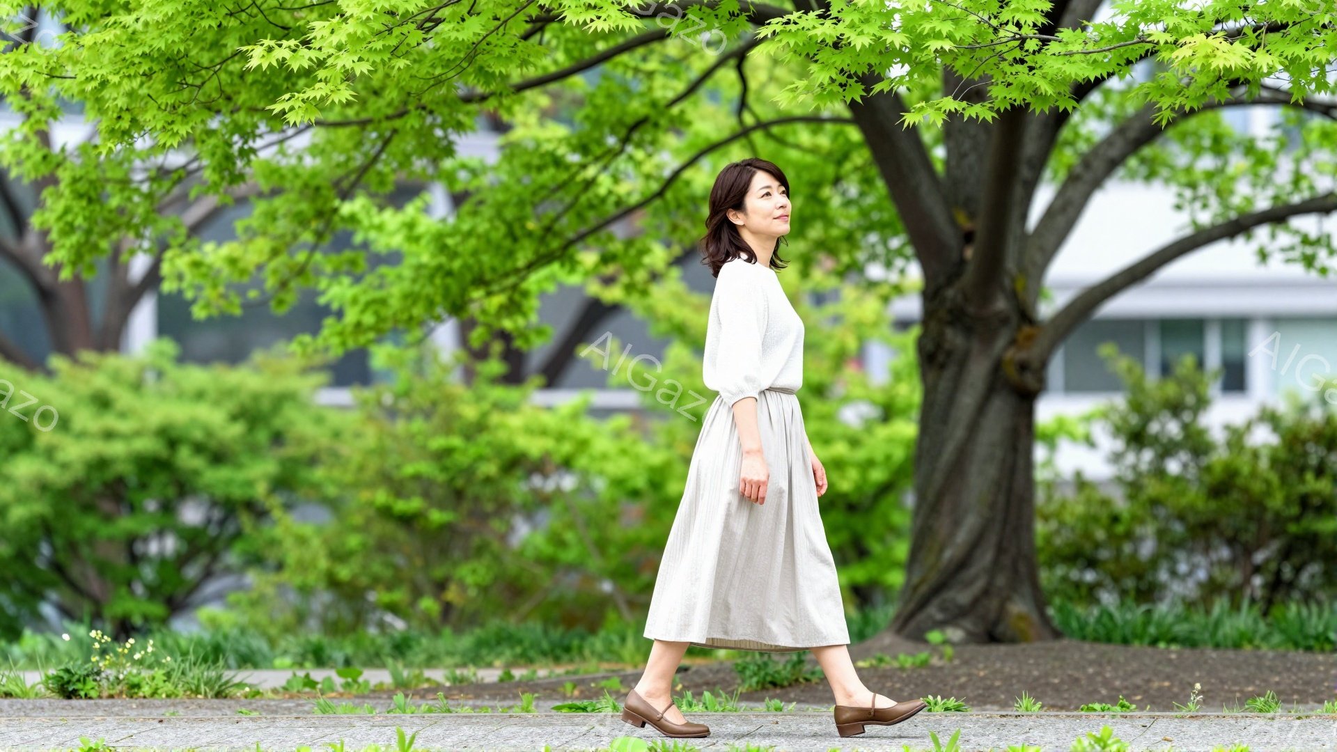画像には、明るい緑の背景の中で、ベージュのミモレ丈スカートと薄いブルーのシャツを着た女性が写っている。彼女は黒のベルトと靴を合わせ、髪は肩にかかるくらいの長さで、穏やかな表情をしている。背景には建物や木々が見え、春または夏の晴れた日の穏やかな散歩の様子を表している。