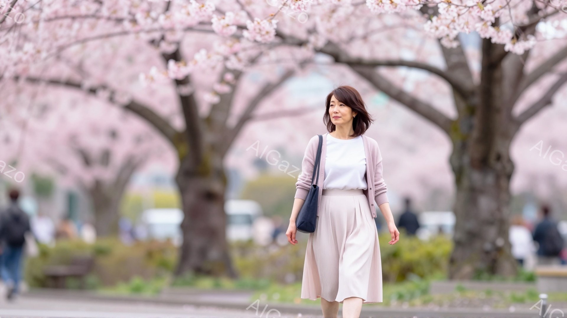 若い女性が桜並木の風景の中で、グレーのジャケットと白いTシャツ、黒いパンツという服装で立っている。彼女は少し横を向き、リラックスした表情で遠くを見つめている。背景にはぼやけた人物や建物が見え、春らしい穏やかな雰囲気である。