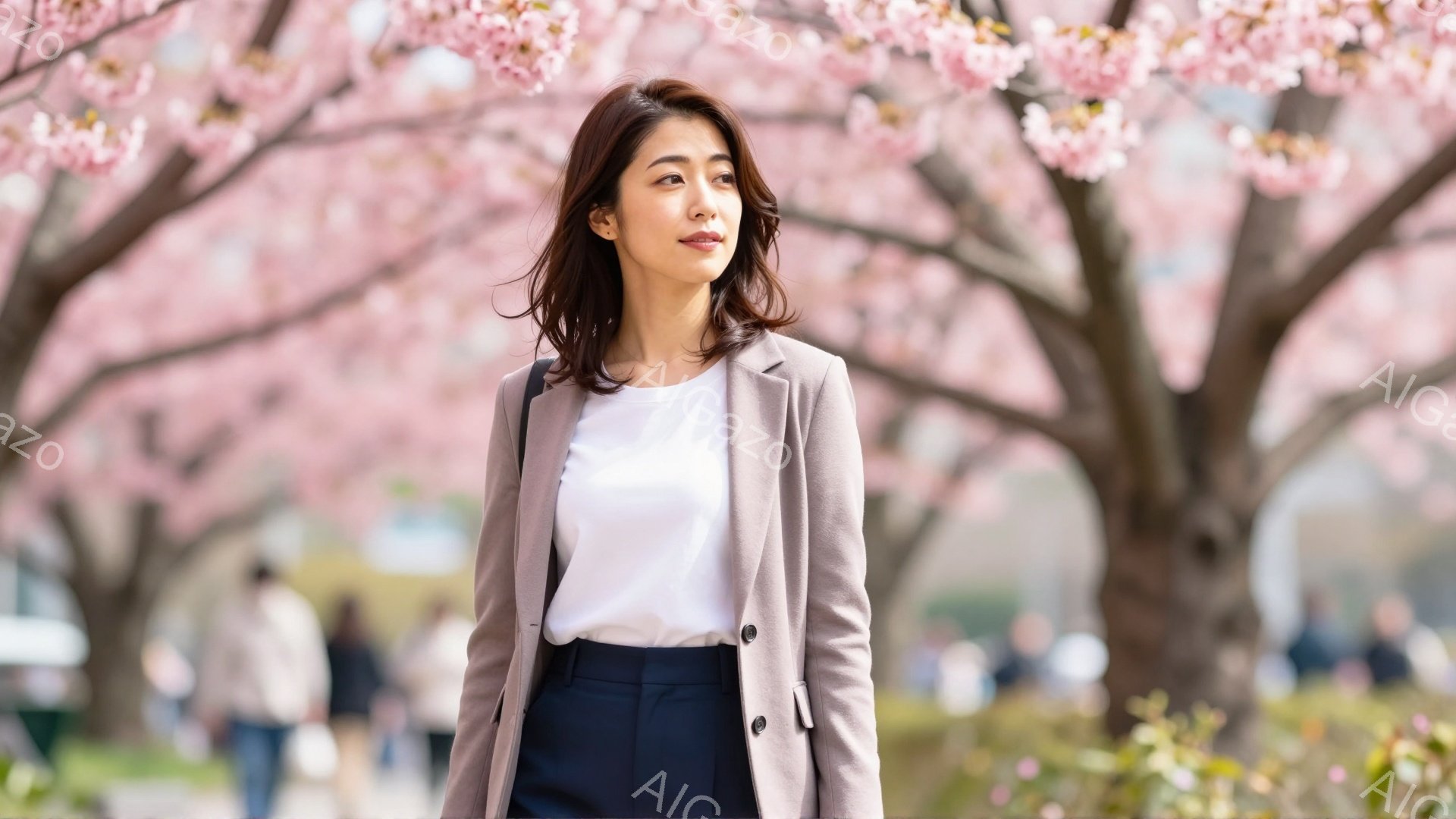 若い女性が、薄いピンク色の長袖シャツとベージュ色のスカートを身に着けて立っています。彼女は肩までの長さのダークブラウンの髪で、少し微笑んでいます。背景には、満開の桜の木々とぼやけた人々の姿があり、春の穏やかな一日を表しています。
