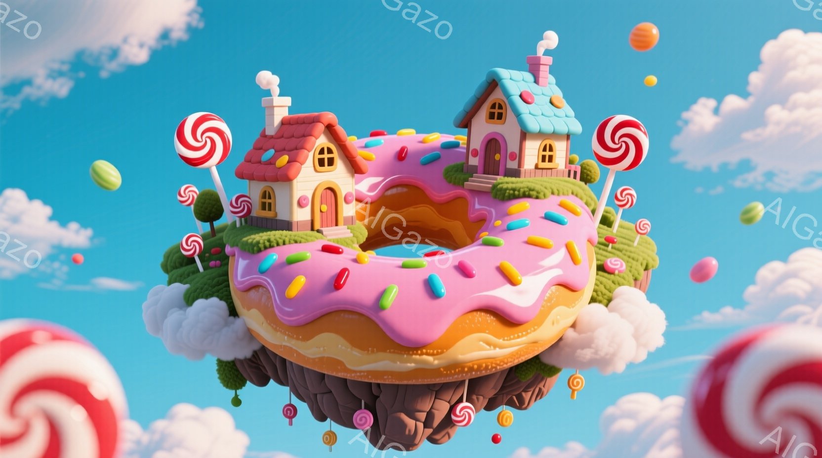 ドーナツ型の浮島が青い空に浮かび、可愛らしい家々が建ち並んでいます。カラフルなスプリンクルとチョコレートソースがドーナツを飾り、キャンディやグミが空中に漂い、まるで夢のような世界観を表現しています。全体的に明るく、遊び心に満ちた雰囲気で、子供向けの絵本のような可愛らしさがあります。