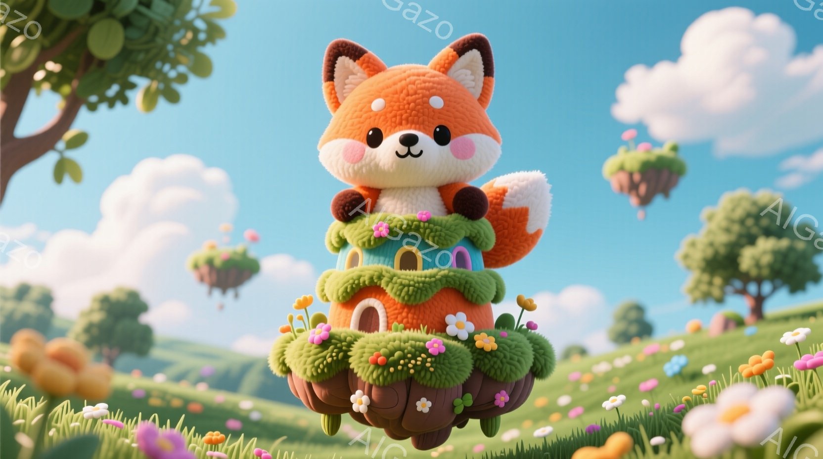 明るい青空の下、浮遊する島の上に愛らしいキツネが立っています。キツネは緑色の葉っぱで飾り付けられた茶色の衣装を着ており、明るい笑顔を見せています。背景には、花や木々が生い茂る他の浮遊島々があり、全体的に夢のような、暖かく平和な雰囲気が漂っています。
