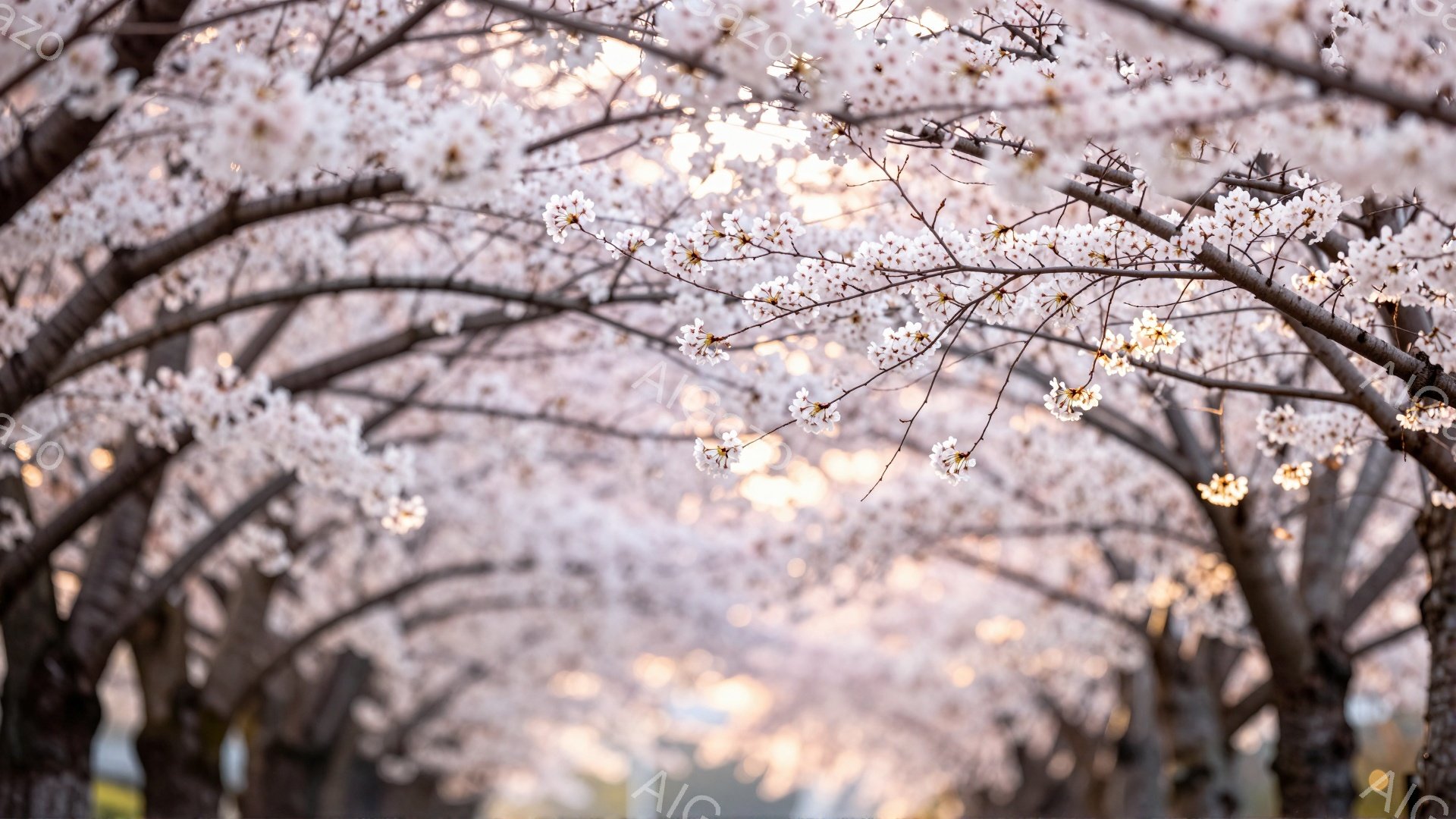 桜のトンネルが印象的な写真です。薄桃色の桜の花びらが空を覆い、光が差し込むことで幻想的な雰囲気が漂っています。背景はぼやけていますが、穏やかな春の陽気を感じさせる、安らぎと希望に満ちた美しい光景です。