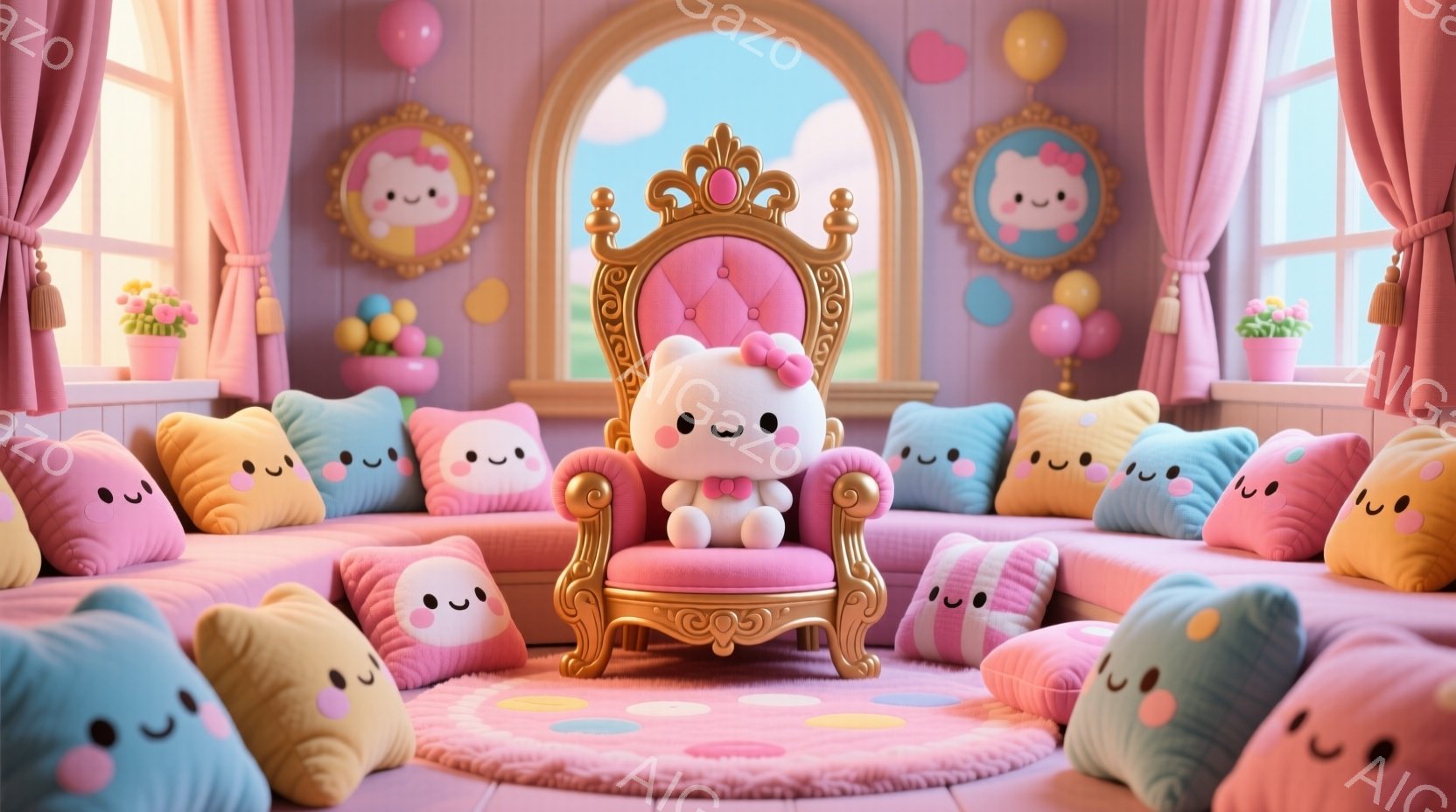 鮮やかなピンクと水色のソファが並び、丸い可愛らしいクッションが至る所に置かれています。中央には金色の装飾が施されたピンクの玉座があり、小さな白い子犬がピンクのドレスを着て座っています。背景には、ハート型の装飾や雲のような形のオブジェがあり、全体的に夢のような、甘い雰囲気です。
