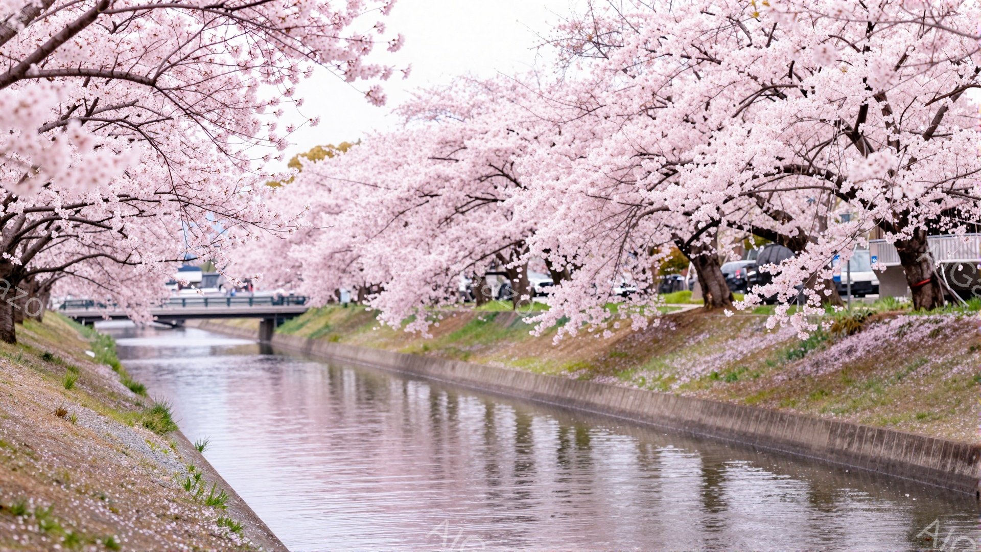 「川沿いに桜並木が続き、満開の桜が水面に映り込み美しい景色が広がっています。コンクリート護岸と草むら、遠くに見える建物が穏やかな春の風景を彩り、水面には落ちた花び」は、2025年12月04日に作成されたAI生成画像です。 運河をテーマとした高品質なビジュアル素材で、 1920×1080px の解像度で提供しています。 個人利用・商用利用ともに無料でダウンロード可能で、クレジット表記も不要です。