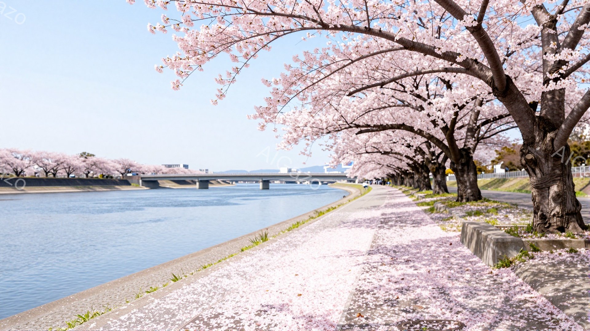 「川沿いに桜が咲き乱れ、薄ピンク色の花びらが水面を覆っている。コンクリートで整備された川岸には緑の草が生え、背景には住宅や建物が見える穏やかな風景だ。全体的に柔ら」は、2025年12月04日に作成されたAI生成画像です。 リラックスをテーマとした高品質なビジュアル素材で、 1920×1080px の解像度で提供しています。 個人利用・商用利用ともに無料でダウンロード可能で、クレジット表記も不要です。
