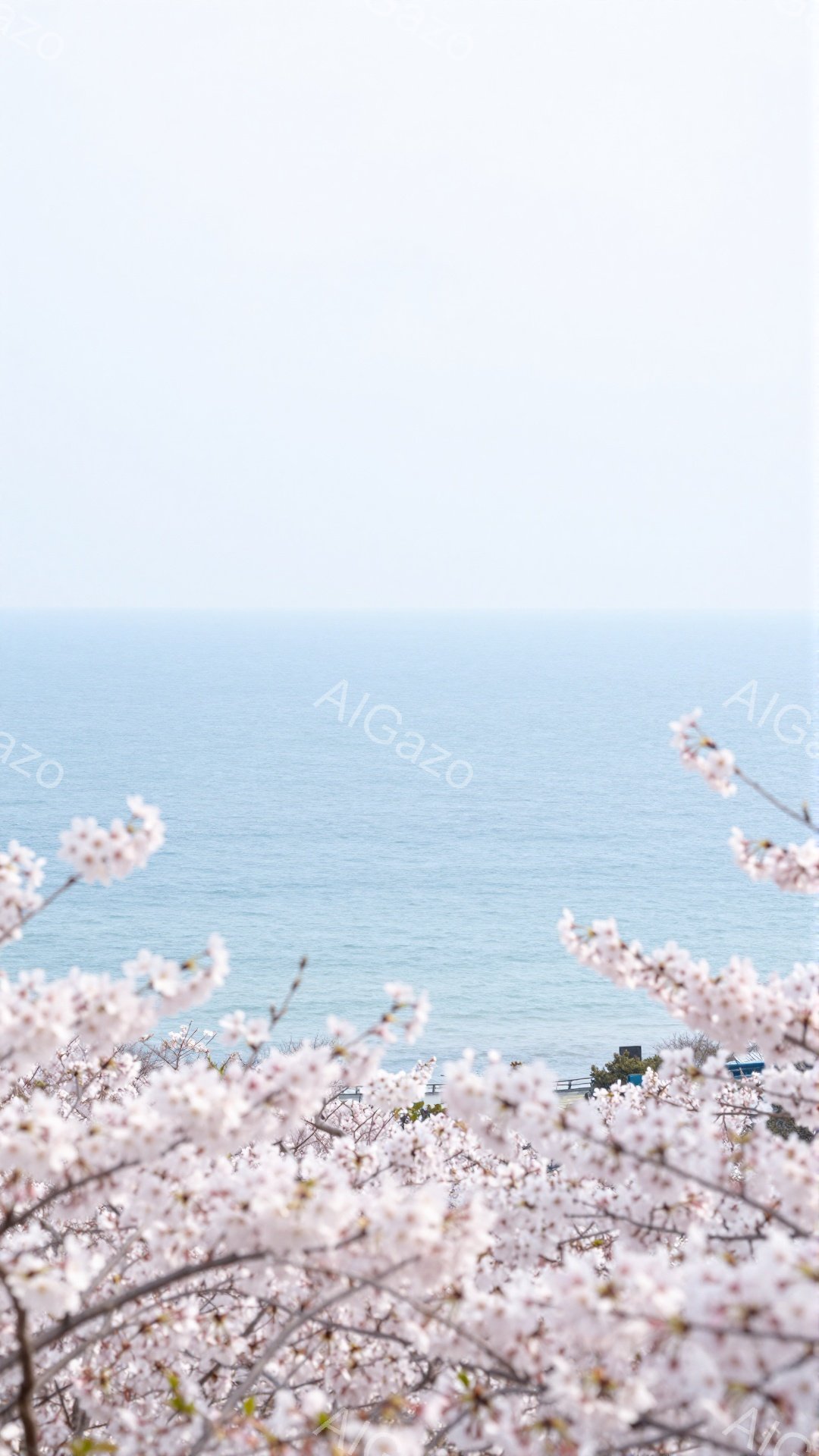 淡いピンク色の桜の花びらが画面全体を覆い、その奥には穏やかな青い海が広がっています。遠くには白い屋根の建物が見え、春の柔らかな日差しが感じられる穏やかな情景です。桜と海が織りなす美しいコントラストが、安らぎと希望に満ちた雰囲気を醸し出しています。