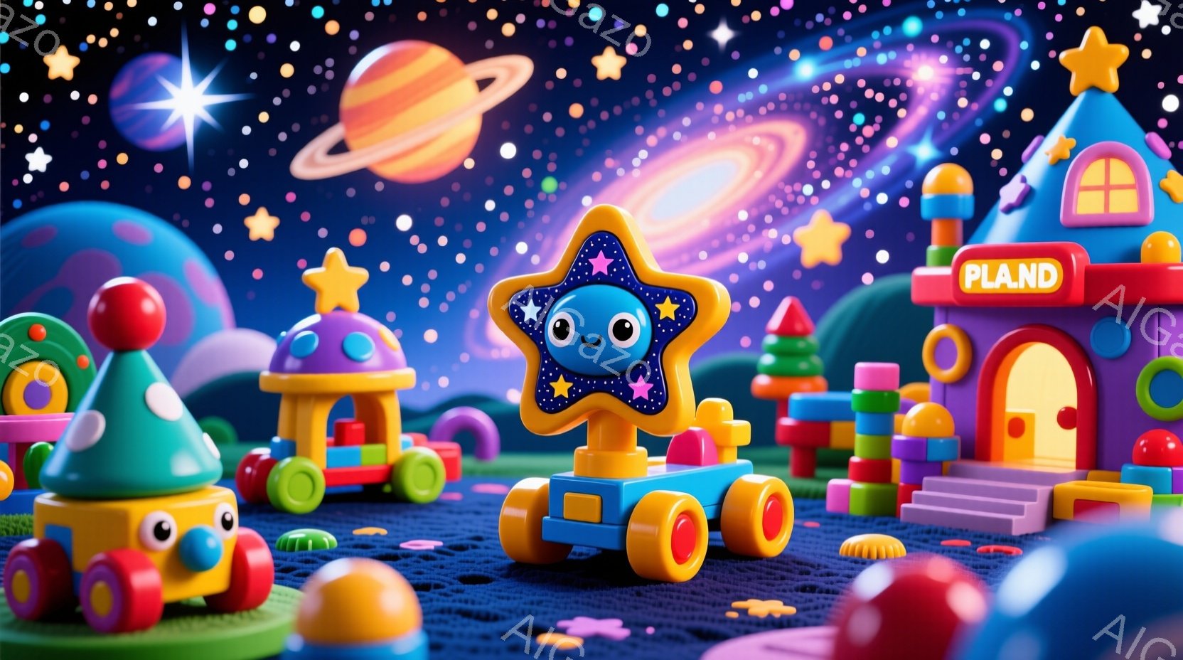 カラフルなブロックでできた建物が並ぶ、おもちゃのような惑星の風景の中に、宇宙飛行士のキャラクターが座っています。緑色の宇宙服を着て、頭には赤い星型の飾りがあり、笑顔でこちらを見ています。背景には、明るい星々が輝き、オレンジ色の惑星が浮かび、夢のような楽しい雰囲気が漂っています。