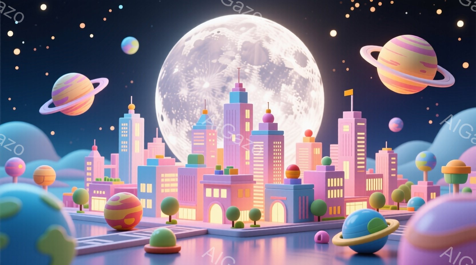明るいピンクと紫色のカラフルな未来都市を描いています。都市は、丸みを帯びた建物やアーチ型の入り口が特徴で、鮮やかな黄色い光が窓から漏れています。背景には、様々な色の惑星が浮かび、巨大な満月が照らし出し、夢のような幻想的な雰囲気を醸し出しています。