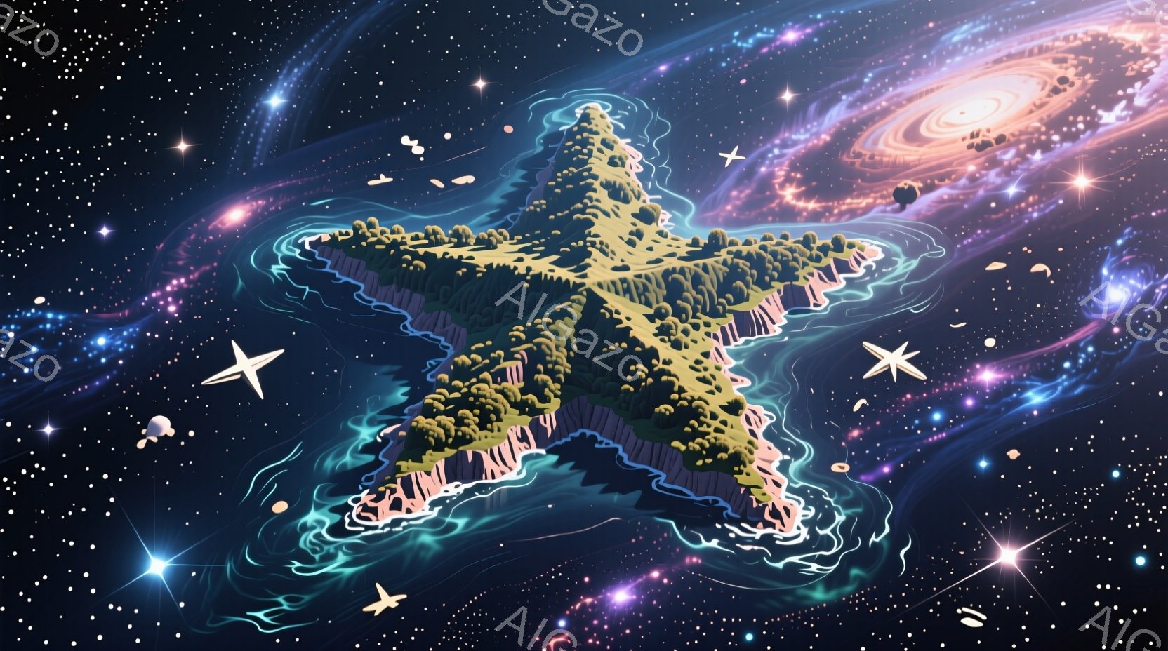 鮮やかな星の形をした島が、渦巻く銀河のような背景の中に浮かんでいる。島は緑豊かな植生で覆われ、海岸線は複雑な形をしており、周囲を青い光の帯が囲んでいる。遠くには小さな惑星や星々が散りばめられ、全体的に幻想的で神秘的な雰囲気を醸し出している。