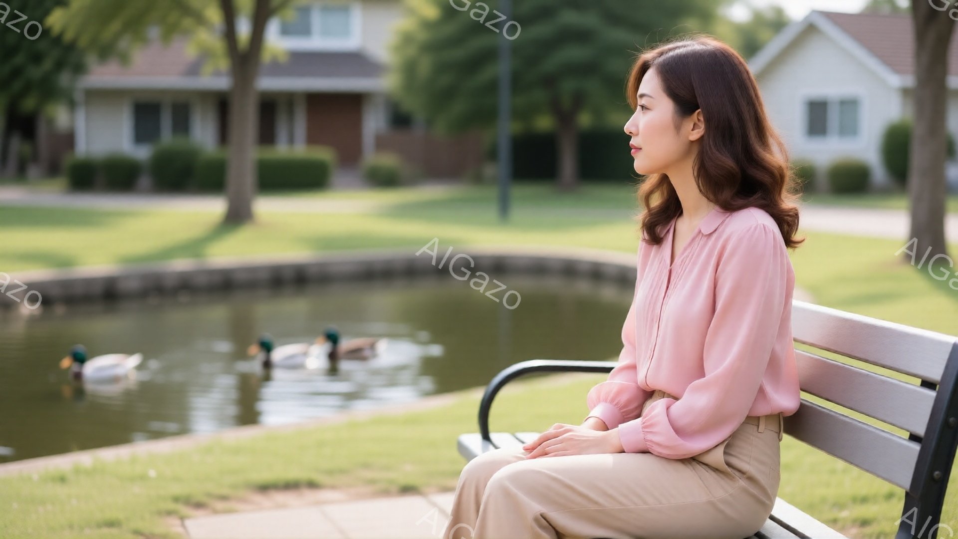 公園のベンチに座る女性は、淡いピンク色のブラウスとベージュ色のパンツを身につけている。彼女は髪を肩まで伸ばし、物憂げな表情で湖の方を見つめている。背景には緑豊かな草地と湖、そして遠くに見える建物があり、穏やかで静かな雰囲気が漂っている。