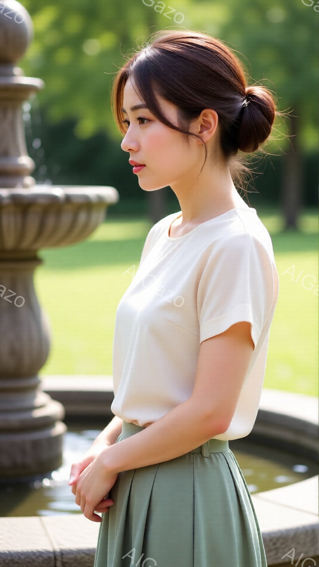 「若い女性が紺色のカーディガンとクリーム色のプリーツスカートを着て、穏やかな表情でこちらを見ている。彼女は膝を揃えて座り、優雅な雰囲気を醸し出している。背景には緑」は、2025年12月04日に作成されたAI生成画像です。 カーディガンをテーマとした高品質なビジュアル素材で、 1080×1920px の解像度で提供しています。 個人利用・商用利用ともに無料でダウンロード可能で、クレジット表記も不要です。