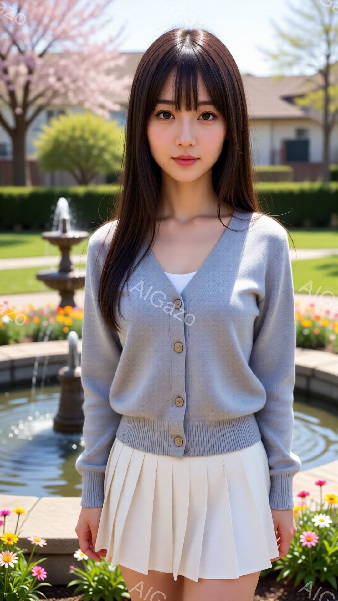 若い女性が、グレーのカーディガンと白いプリーツスカートを着て立っています。彼女は長い黒髪で、少し微笑んだ表情をしています。背景には美しい庭園、噴水、そして穏やかな天候が見られ、全体的に明るく爽やかな雰囲気です。