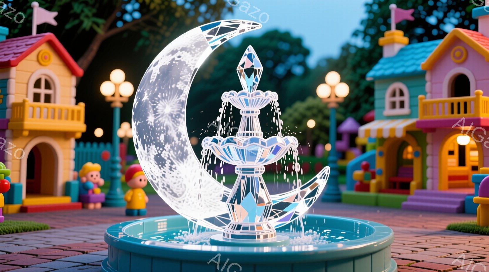 カラフルなミニチュアの町並みを背景にした、透明な噴水の様子を描いています。噴水は複雑な形をしており、水が輝きながら流れ落ちています。背景には、可愛らしい建物、緑の茂み、そして青い空が広がり、おもちゃのような温かく楽しい雰囲気が漂っています。