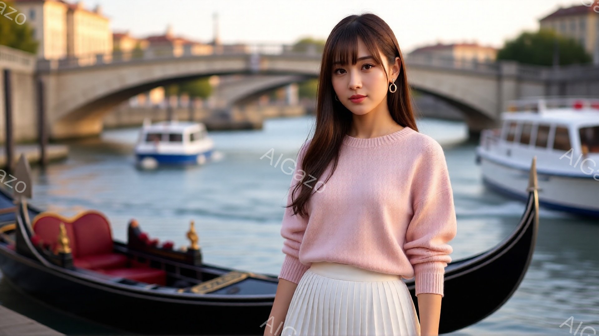 ピンク色のセーターに白いプリーツスカートを身につけた女性が、ヴェネツィアの運河沿いに立っています。彼女は落ち着いた表情で、正面を見つめています。背景にはゴンドラやボートが浮かび、遠くには建物が見え、穏やかな晴天のヴェネツィアの風景が広がっています。