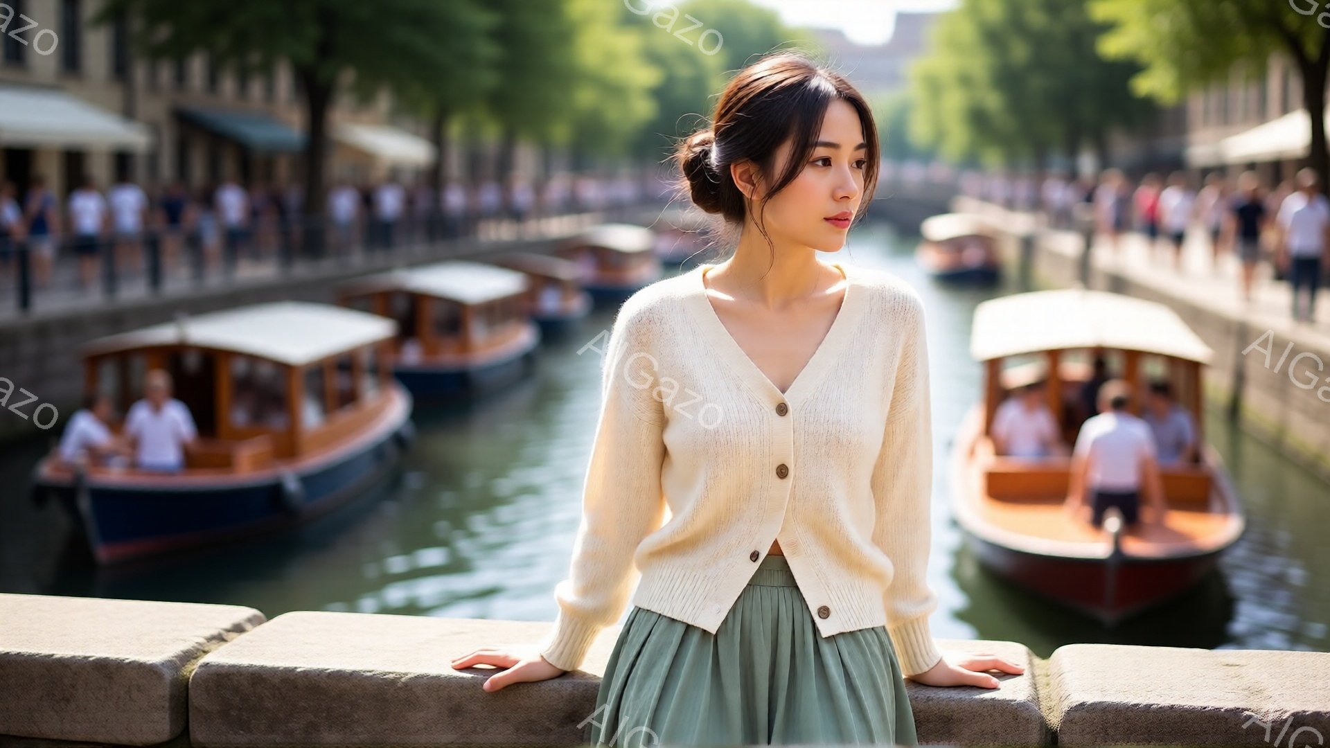 長い髪を後ろでまとめた女性が、運河沿いの石垣に肘をついて立っている。オフホワイトのニットカーディガンに、薄い緑色のスカートを合わせ、カジュアルながらも上品な装いをしている。背景には、観光客を乗せたボートが浮かび、石造りの建物が並び、晴れた空の下、穏やかな雰囲気が漂っている。