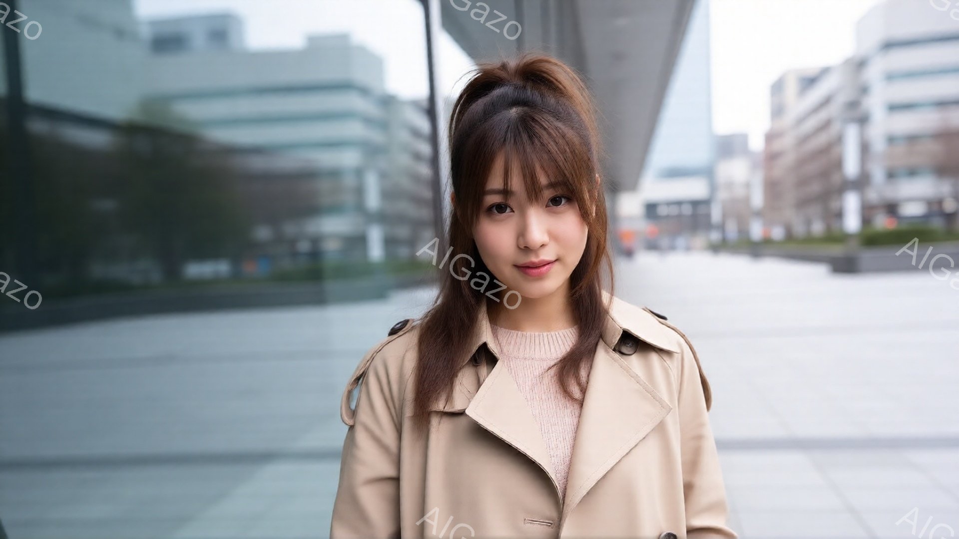 明るい茶色の髪を耳にかける女性が、ベージュ色のトレンチコートと薄いセーターを着ています。彼女は少し横を向き、遠くを見つめており、穏やかで物憂げな表情をしています。背景には近代的な建物が写り、曇り空の下、都会の風景が広がっています。