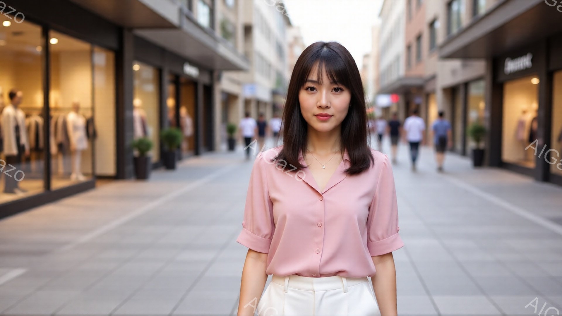 明るいピンク色のブラウスに白いパンツを着用した若い女性が、石畳の通りで正面を見据えています。彼女は肩までの長さの黒髪で、穏やかな微笑みを浮かべており、姿勢も自然でリラックスしています。背景には、高級ブランド店が並び、石畳の道には他の歩行者もおり、晴れた日の賑やかな街並みを背景に、洗練された雰囲気が漂っています。