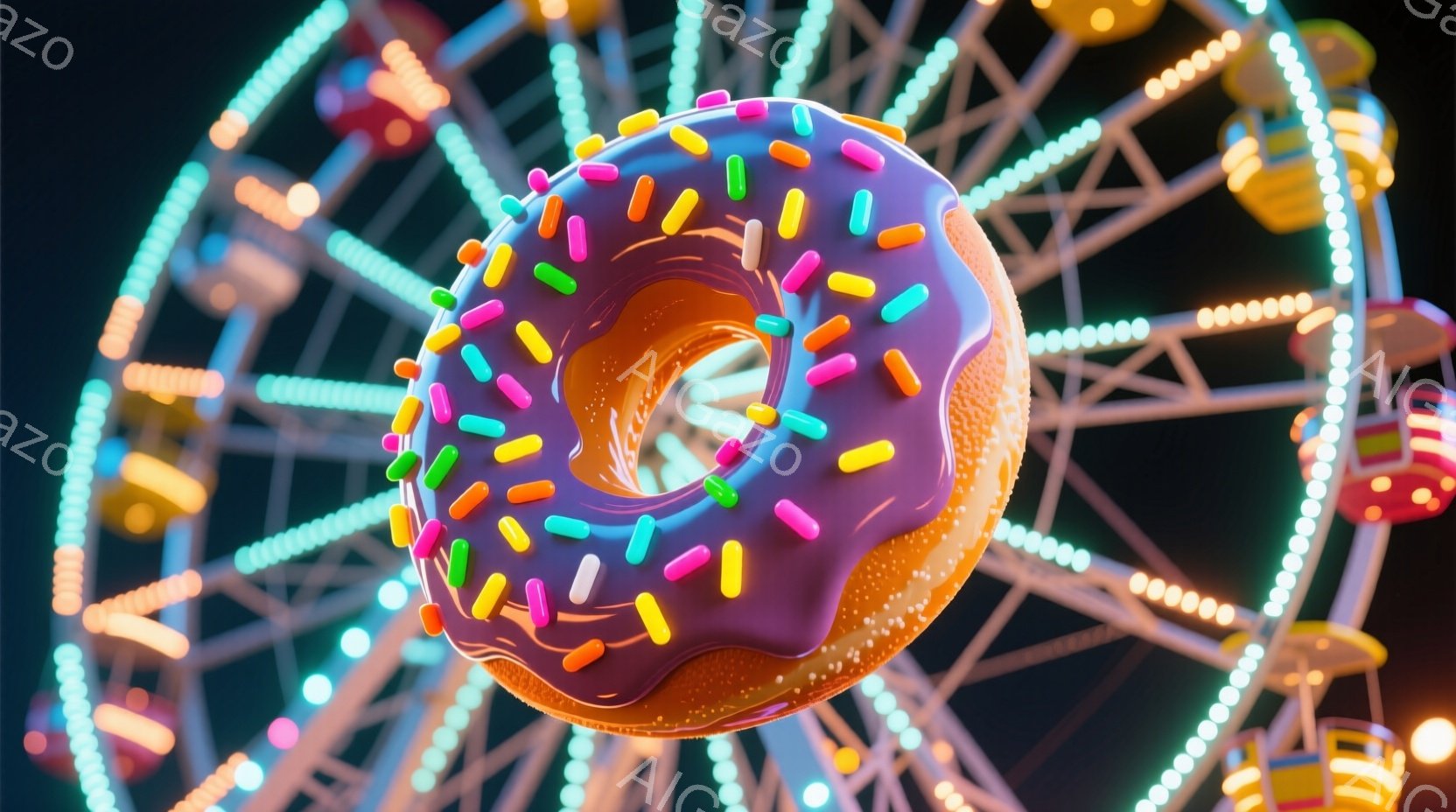 鮮やかなピンク色のアイシングとカラフルなスプリンクルが施された大きなドーナツが、遊園地の観覧車を背景に浮かび上がっています。観覧車はネオンライトで照らされ、夜空に輝き、遊び心溢れる雰囲気を醸し出しています。ドーナツと観覧車は、まるで夢のような、甘くて楽しい世界を表現しているようです。