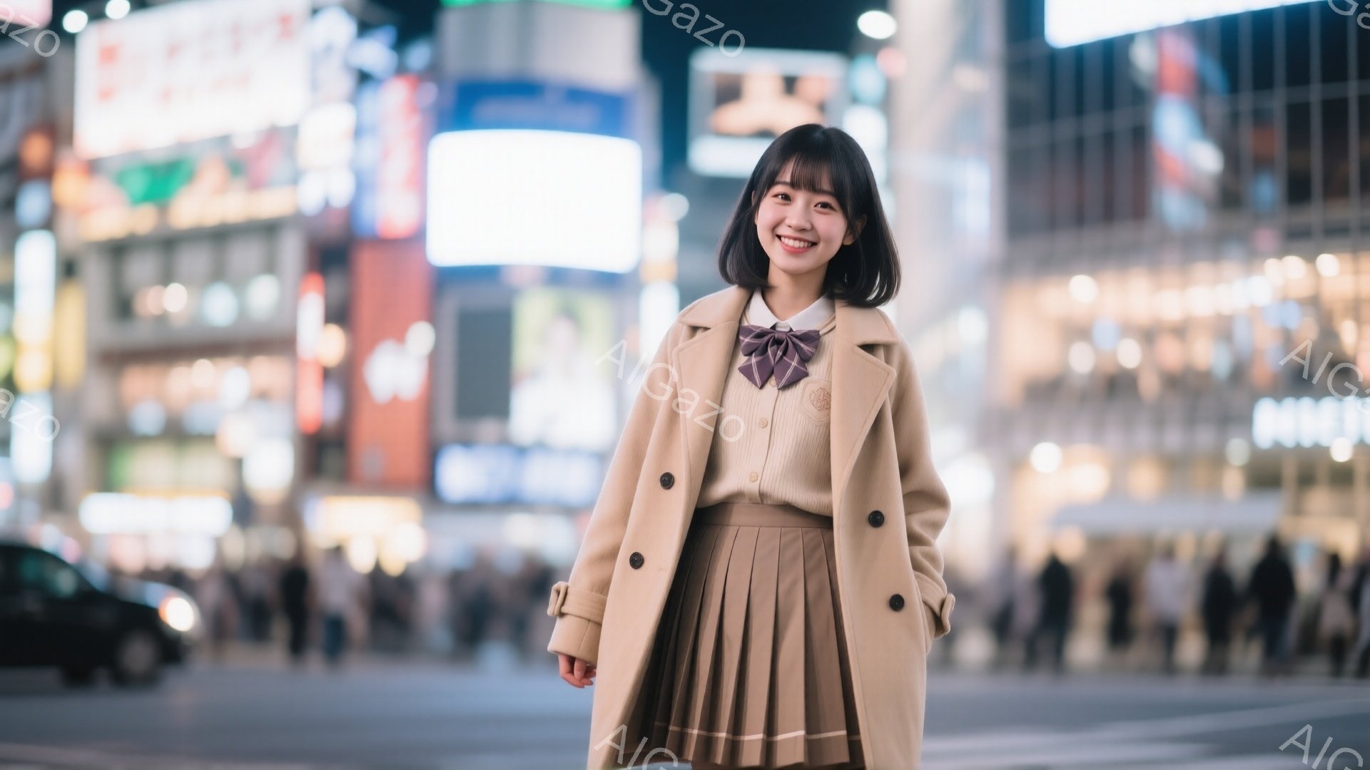 若い女性が、明るい街路に立っており、ベージュ色のオーバーコート、白いシャツ、ネクタイ、プリーツスカートという制服のような服装をしています。彼女は微笑んでおり、両手をポケットに入れています。背景には、夜間に光る多くのネオンサインと建物があり、活気のある都市の雰囲気を感じさせます。