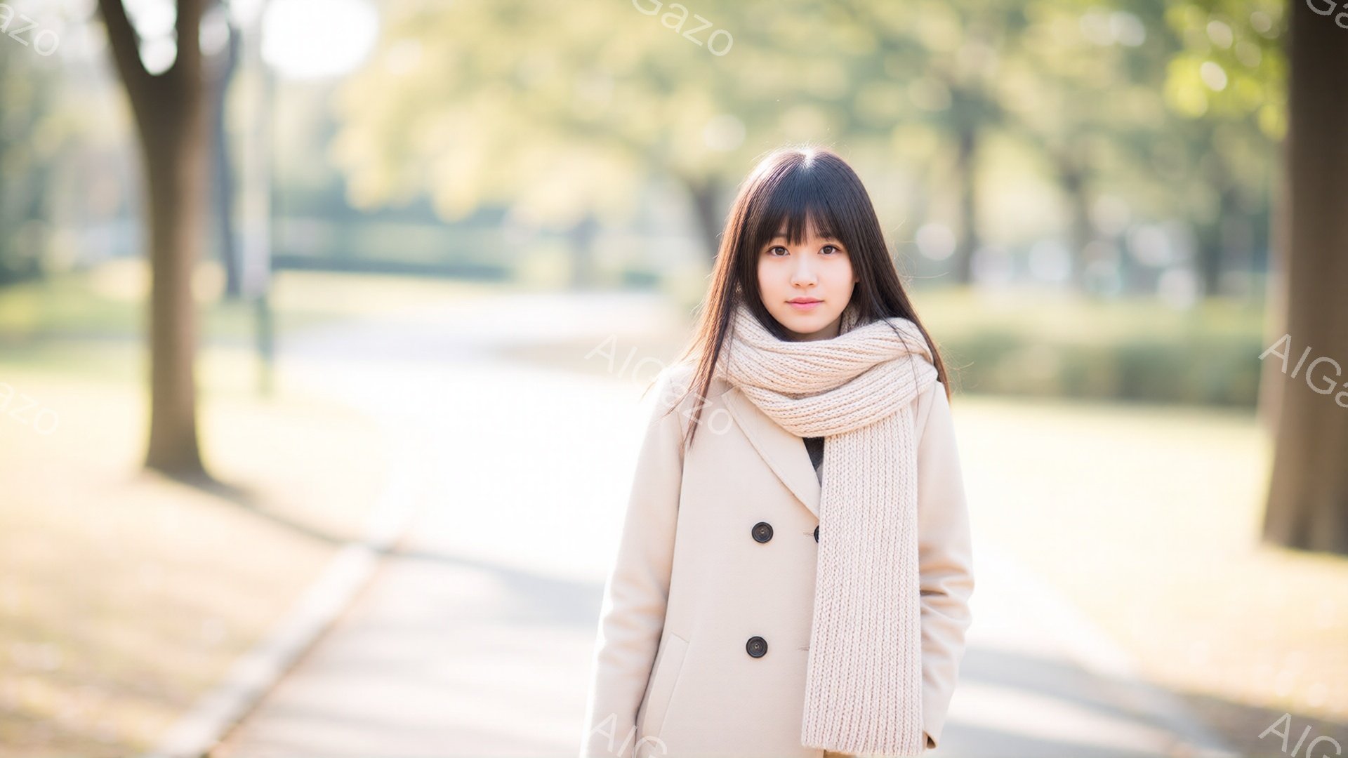 若い女性がベージュ色のトレンチコートと白いマフラーを身に着けて立っています。彼女は両手をポケットにしまい、穏やかな表情でカメラを見ています。背景にはぼやけた木々と遊歩道が広がり、柔らかい光が差し込んでいます。