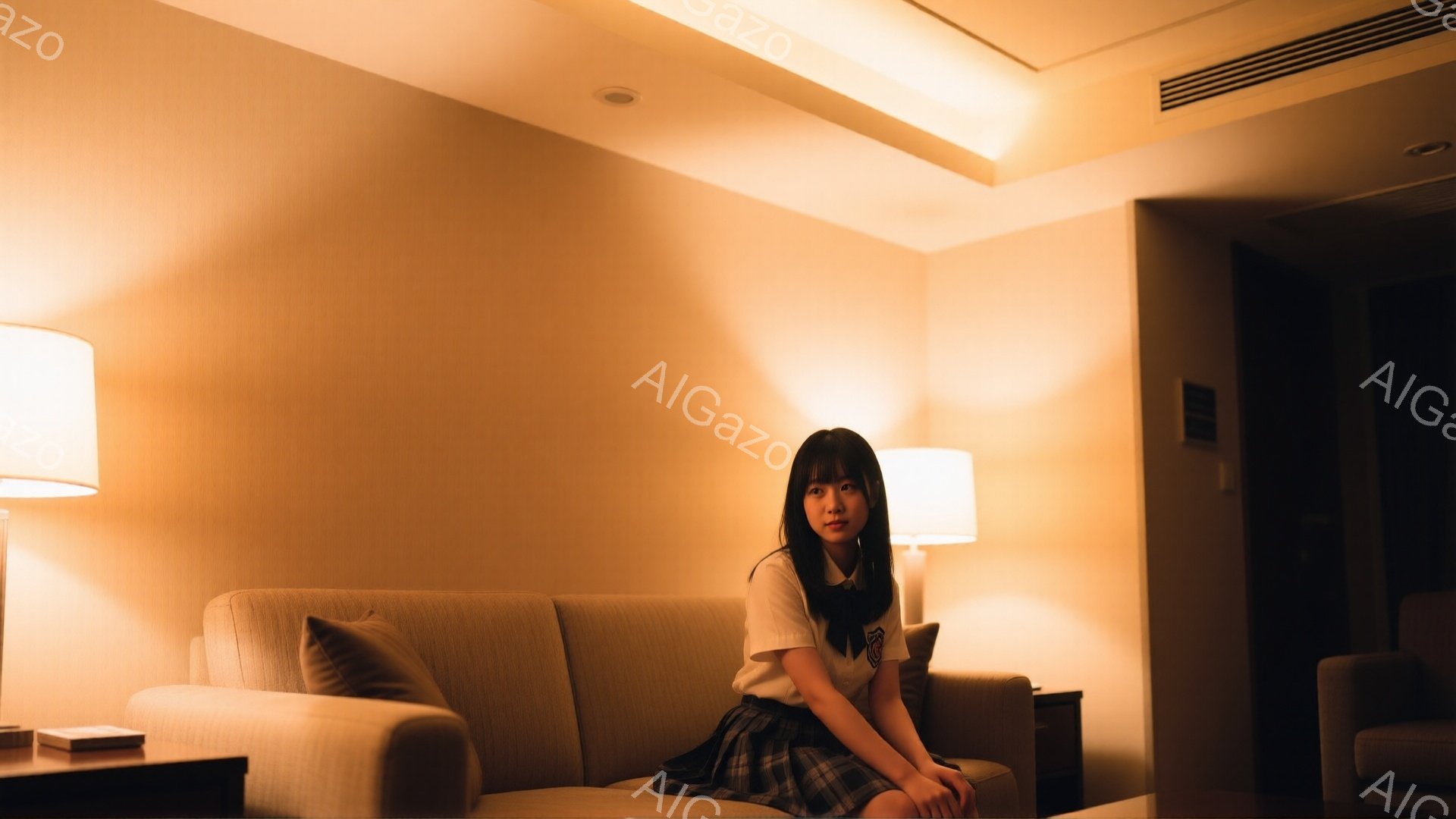 画像には、セーラー服を着た若い女性が、ベージュ色のソファに座って正面を見つめています。彼女はダークブラウンのロングヘアで、少し物憂げな表情をしています。背景はホテルの一室のようで、暖色系の照明が全体を照らし、落ち着いた雰囲気を醸し出しています。