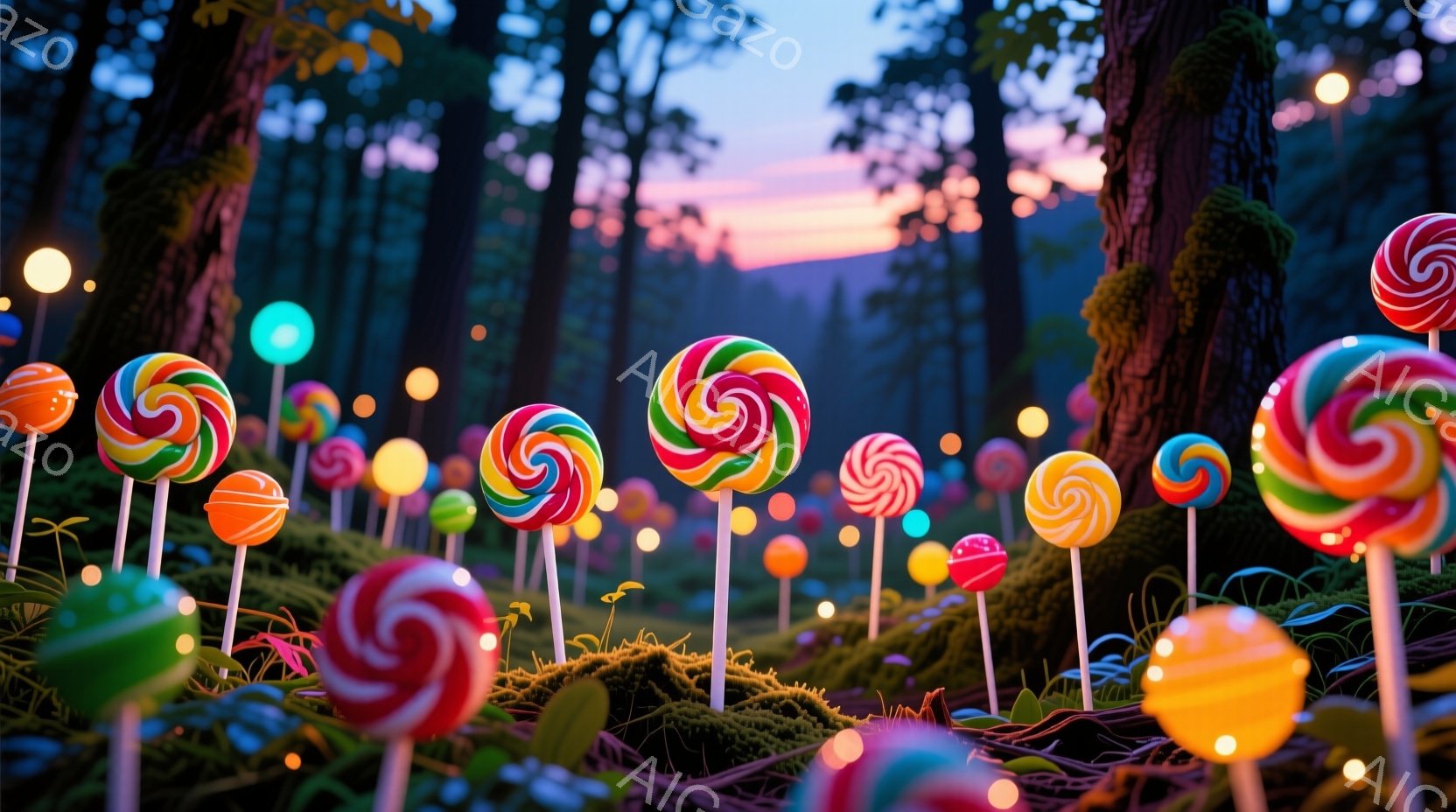 鮮やかな渦巻き模様のキャンディが、緑豊かな森の中に並んで咲き誇る様子が描かれています。背景には、夕焼け空と、ぼんやりとした木々が見え、幻想的な雰囲気を醸し出しています。地面には苔が生え、小さな光の粒子が舞い、まるで妖精の住む世界のような、夢幻的な光景です。