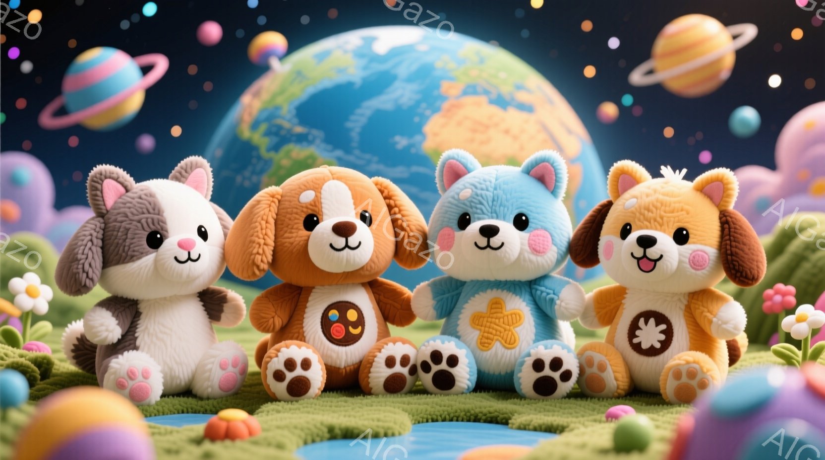 ふわふわの犬、猫、熊のぬいぐるみたちが、カラフルな草原に並んで座っています。それぞれのぬいぐるみは愛らしい表情で、犬は赤と白、猫は茶色、熊は水色と可愛らしい色合いです。背景には、様々な惑星やカラフルなキノコ、花々が描かれ、夢のようなファンタジックな雰囲気を作り出しています。