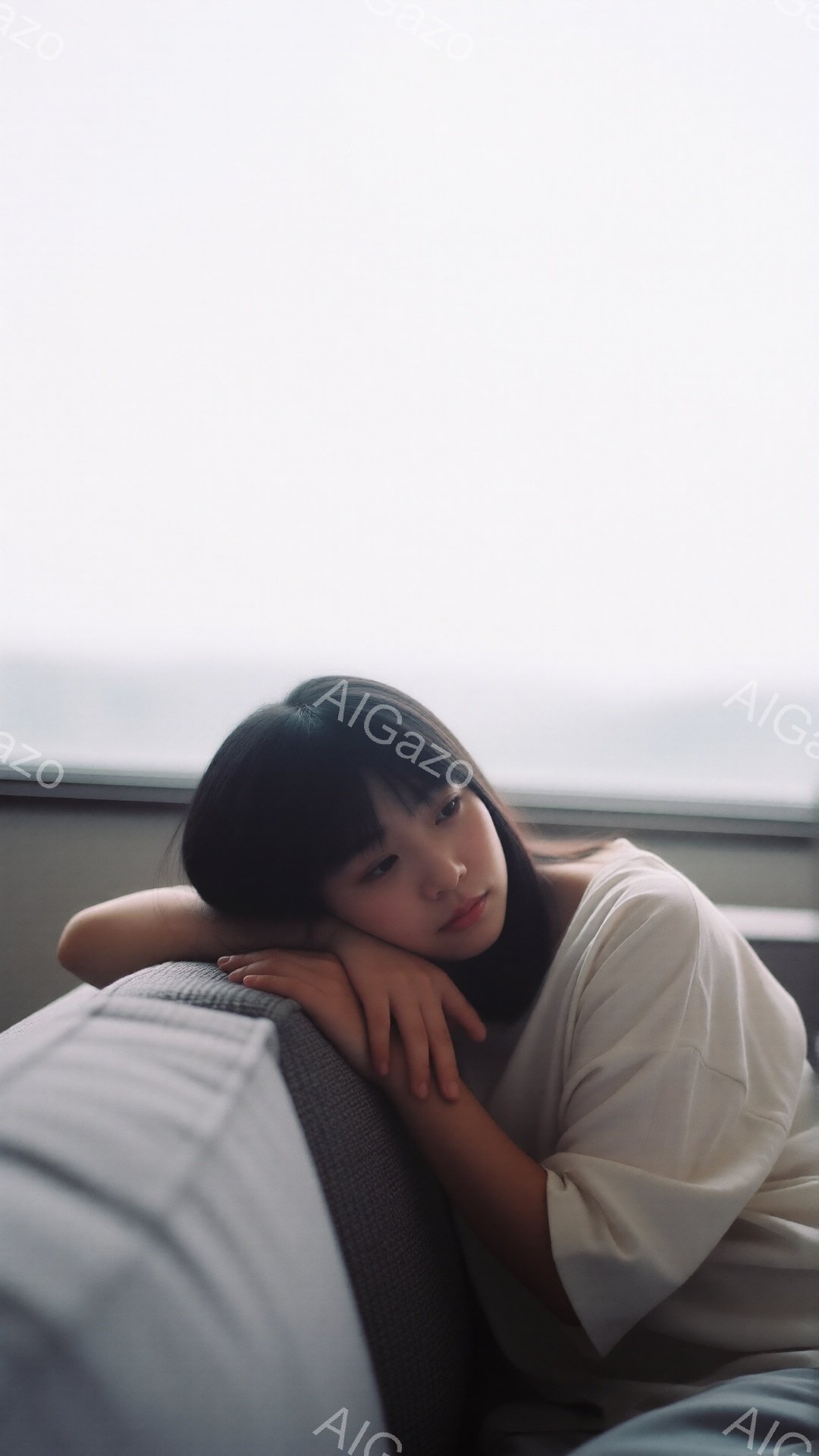 黒髪の女性がグレーのソファに肘をついて横たわっており、やや物憂げな表情を浮かべている。白いTシャツを着ており、髪は肩にかかる程度の長さで、前髪が少し目にかかっている。背景はぼやけており、室内であることがわかるが、詳細は不明で、全体的に落ち着いた雰囲気が漂っている。