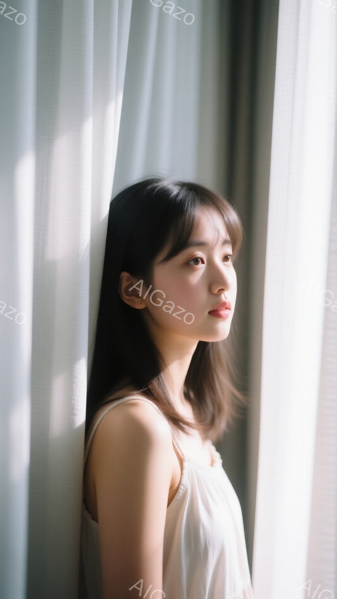 光が差し込む窓辺で、若い女性が写っている。彼女は肩出しのクリーム色のトップスを着ており、長い黒髪は自然に肩にかかっている。表情は穏やかで、少し微笑んでいるように見え、全体的に柔らかく優しい雰囲気を醸し出している。