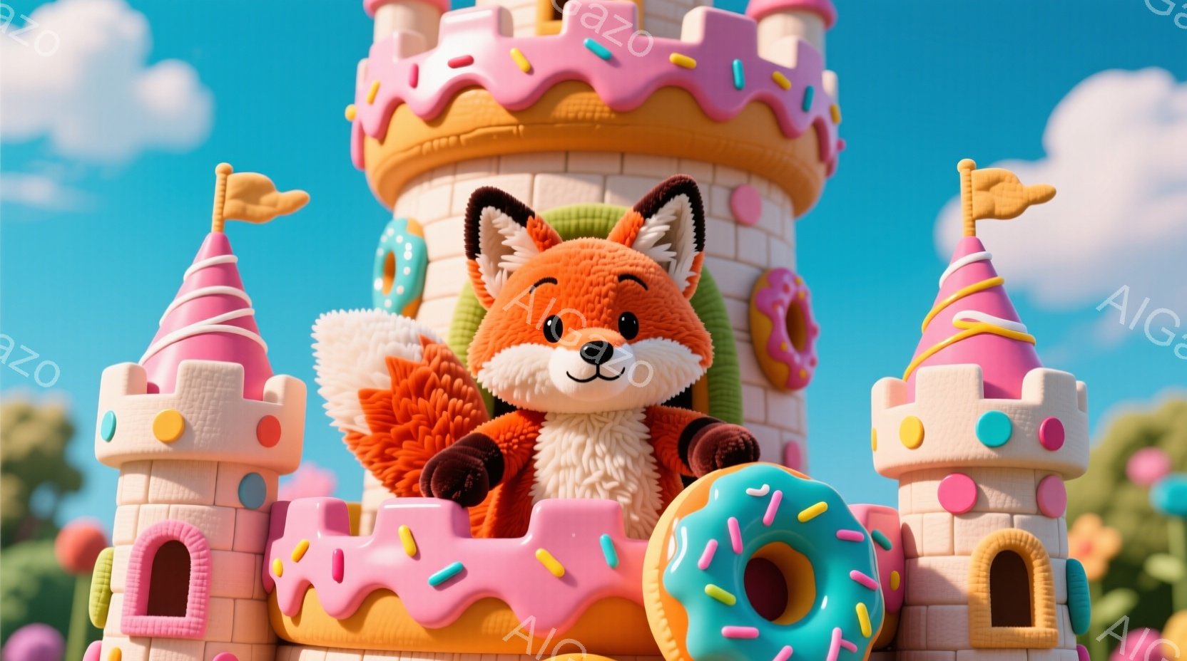 明るい空の下、クリーム色の城壁の上に大きなピンク色のドーナツがあり、その上にふわふわのオレンジ色の狐が座っています。狐は嬉しそうな表情で、まっすぐ前を見ており、周りには様々な色のドーナツが散りばめられています。背景には緑豊かな木々があり、全体的に夢のような、遊び心のある雰囲気です。