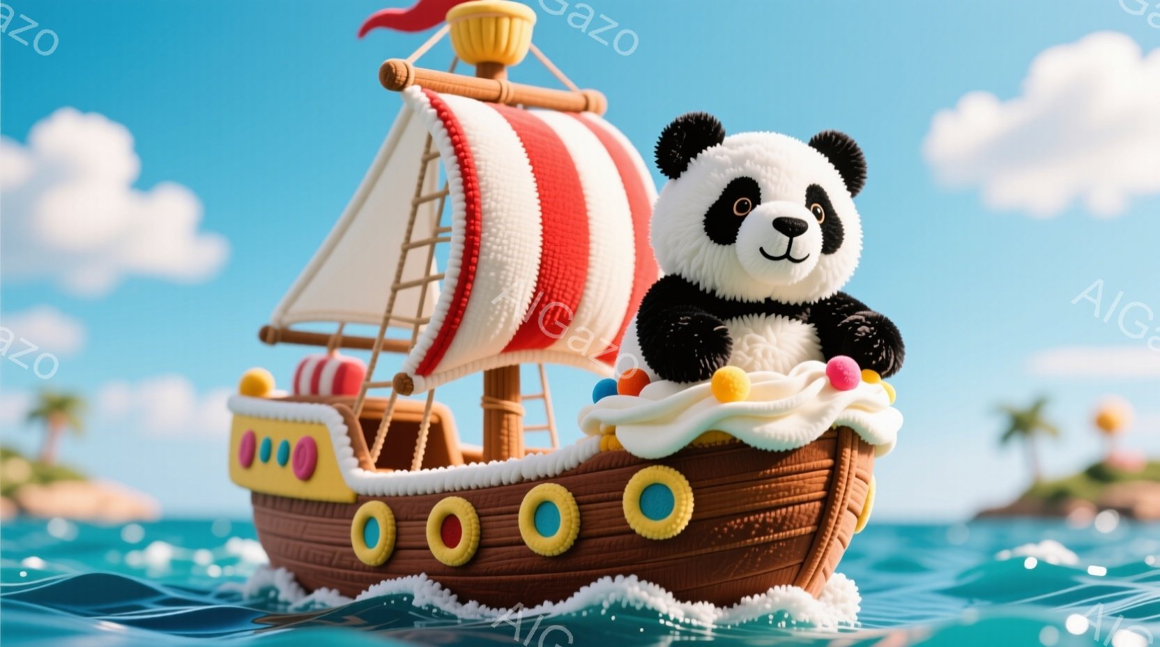パンダが小さなボートに乗って海を航海しています。パンダは片手を上げており、楽しそうな表情をしています。背景には青い空と穏やかな波が見え、全体的に明るく陽気な雰囲気です。