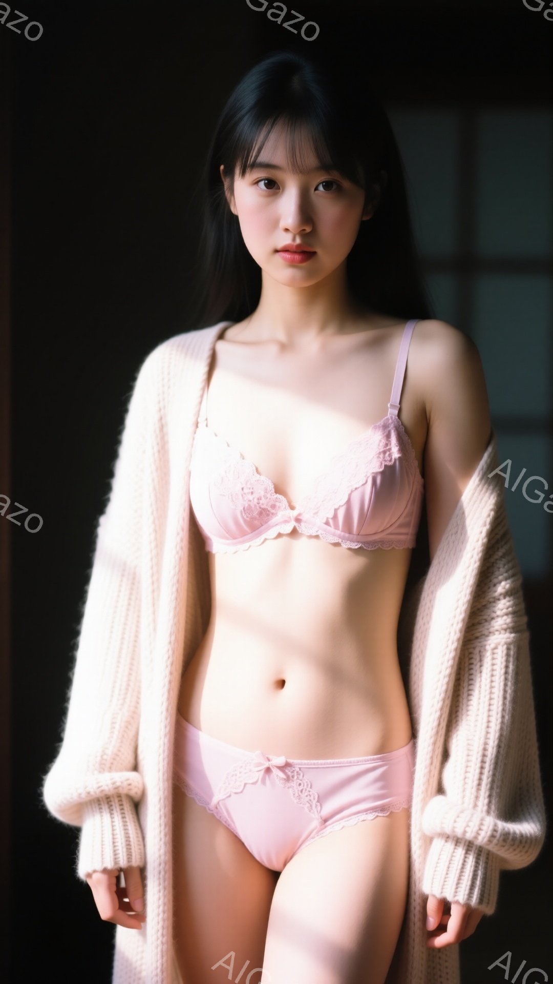 「モデルは薄いピンク色のレースのブラとショーツを着用し、ベージュのニットカーディガンを羽織っています。彼女はやや微笑んでおり、黒髪を耳にかけると、少し横を向いてい」は、2025年12月04日に作成されたAI生成画像です。 カーディガンをテーマとした高品質なビジュアル素材で、 1080×1920px の解像度で提供しています。 個人利用・商用利用ともに無料でダウンロード可能で、クレジット表記も不要です。